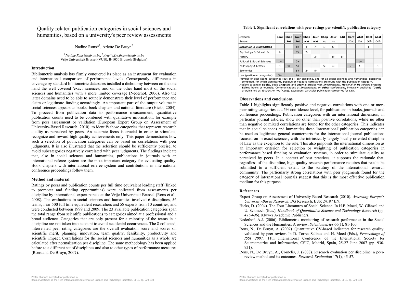 Bibliometric analysis has firmly conquered its place as an instrument for evaluation and international comparison of performance levels. Consequently, differences in coverage by standard bibliometric databases installed a dichotomy between on the one hand the well covered 'exact' sciences, and on the other hand most of the social sciences and humanities with a more limited coverage (Nederhof, 2006). Also the latter domains need to be able to soundly demonstrate their level of performance and claim or legitimate funding accordingly. An important part of the output volume in social sciences appears as books, book chapters and national literature (Hicks, 2004). To proceed from publication data to performance measurement, quantitative publication counts need to be combined with qualitative information, for example from peer assessment or validation (European Expert Group on Assessment of University-Based Research, 2010), to identify those categories that represent research quality as perceived by peers. An accurate focus is crucial in order to stimulate, recognize and reward high quality achievements only. This paper demonstrates how such a selection of publication categories can be based on correlations with peer judgments. It is also illustrated that the selection should be sufficiently precise, to avoid subcategories negatively correlated with peer judgments. The findings indicate that, also in social sciences and humanities, publications in journals with an international referee system are the most important category for evaluating quality. Book chapters with international referee system and contributions in international conference proceedings follow them.