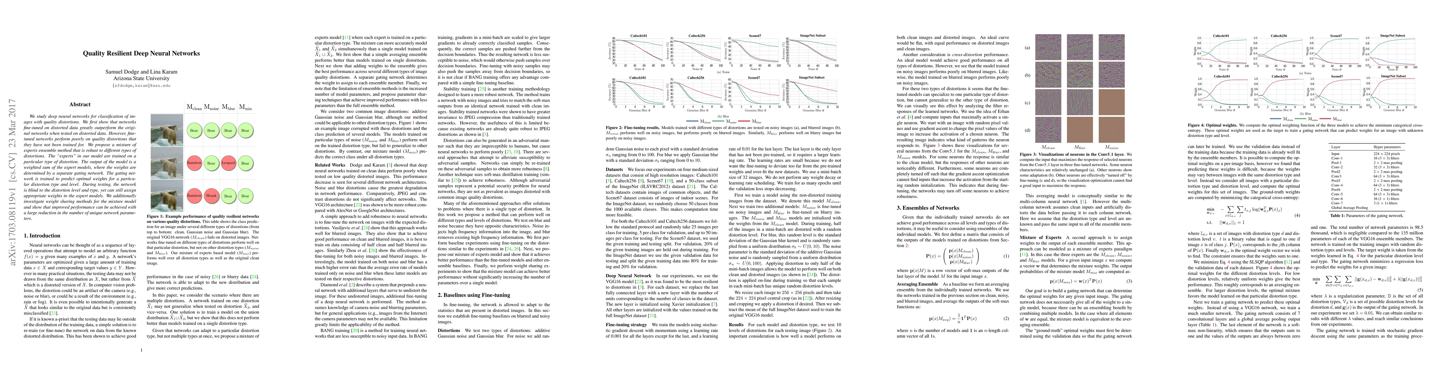 We study deep neural networks for classification of images with quality distortions. We first show that networks fine-tuned on distorted data greatly outperform the original networks when tested on distorted data. However, fine-tuned networks perform poorly on quality distortions that they have not been trained for. We propose a mixture of experts ensemble method that is robust to different types of distortions. The "experts" in our model are trained on a particular type of distortion. The output of the model is a weighted sum of the expert models, where the weights are determined by a separate gating network. The gating network is trained to predict optimal weights for a particular distortion type and level. During testing, the network is blind to the distortion level and type, yet can still assign appropriate weights to the expert models. We additionally investigate weight sharing methods for the mixture model and show that improved performance can be achieved with a large reduction in the number of unique network parameters.