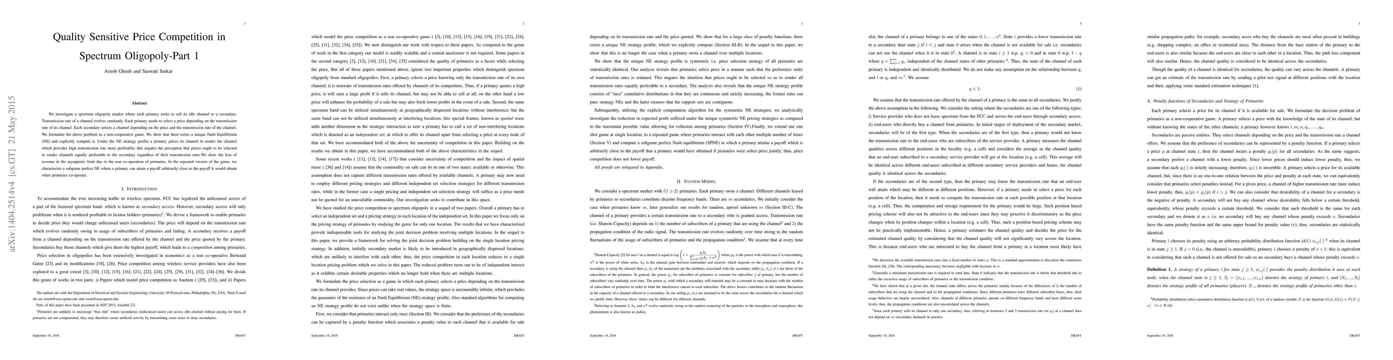 We investigate a spectrum oligopoly market where primaries lease their channels to secondaries in lieu of financial remuneration. Transmission quality of a channel evolves randomly. Each primary has to select the price it would quote without knowing the transmission qualities of its competitors' channels. Each secondary buys a channel depending on the price and the transmission quality a channel offers. We formulate the price selection problem as a non co-operative game with primaries as players. In the one-shot game, we show that there exists a unique symmetric Nash Equilibrium(NE) strategy profile and explicitly compute it. Our analysis reveals that under the NE strategy profile a primary prices its channel to render high quality channel more preferable to the secondary; this negates the popular belief that prices ought to be selected to render channels equally preferable to the secondary regardless of their qualities. We show the loss of revenue in the asymptotic limit due to the non co-operation of primaries. In the repeated version of the game, we characterize a subgame perfect NE where a primary can attain a payoff arbitrarily close to the payoff it would obtain when primaries co-operate.