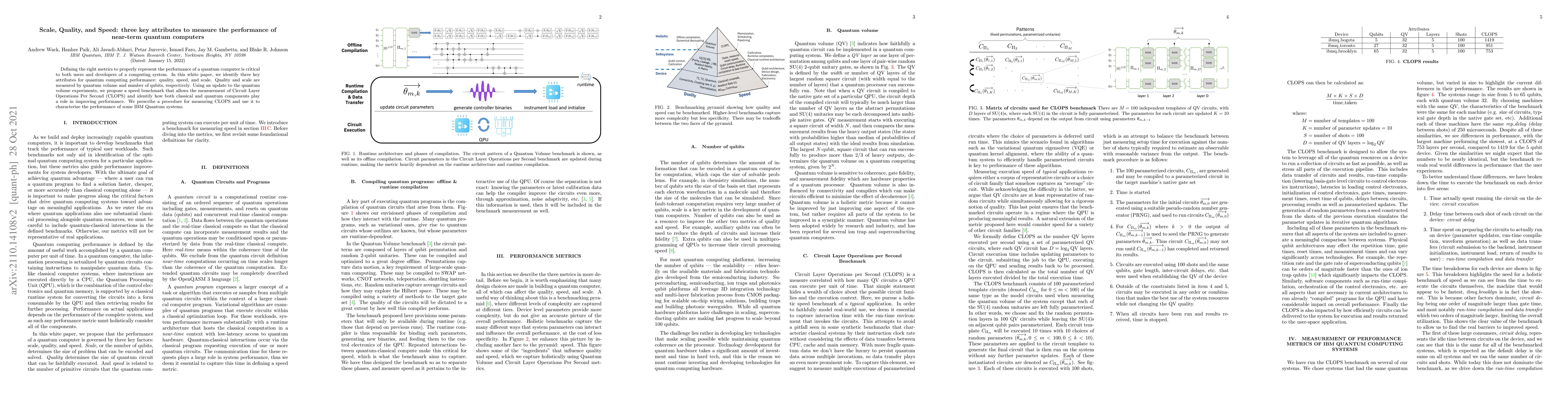 Defining the right metrics to properly represent the performance of a quantum computer is critical to both users and developers of a computing system. In this white paper, we identify three key attributes for quantum computing performance: quality, speed, and scale. Quality and scale are measured by quantum volume and number of qubits, respectively. We propose a speed benchmark, using an update to the quantum volume experiments that allows the measurement of Circuit Layer Operations Per Second (CLOPS) and identify how both classical and quantum components play a role in improving performance. We prescribe a procedure for measuring CLOPS and use it to characterize the performance of some IBM Quantum systems.