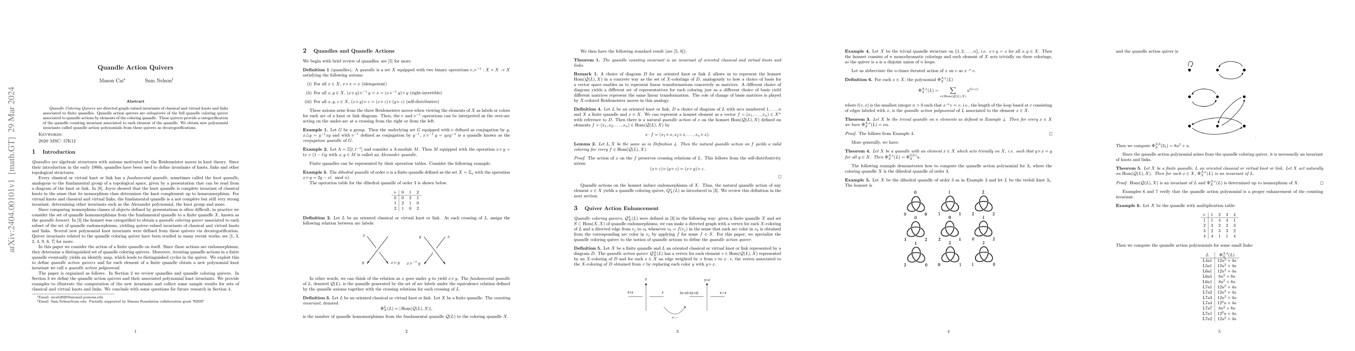 This paper introduces quandle action quivers, directed graphs that are invariants of knots and links related to finite quandles, offering a categorification of quandle counting invariants. It derives new polynomial invariants, known as quandle action polynomials, from these quivers.