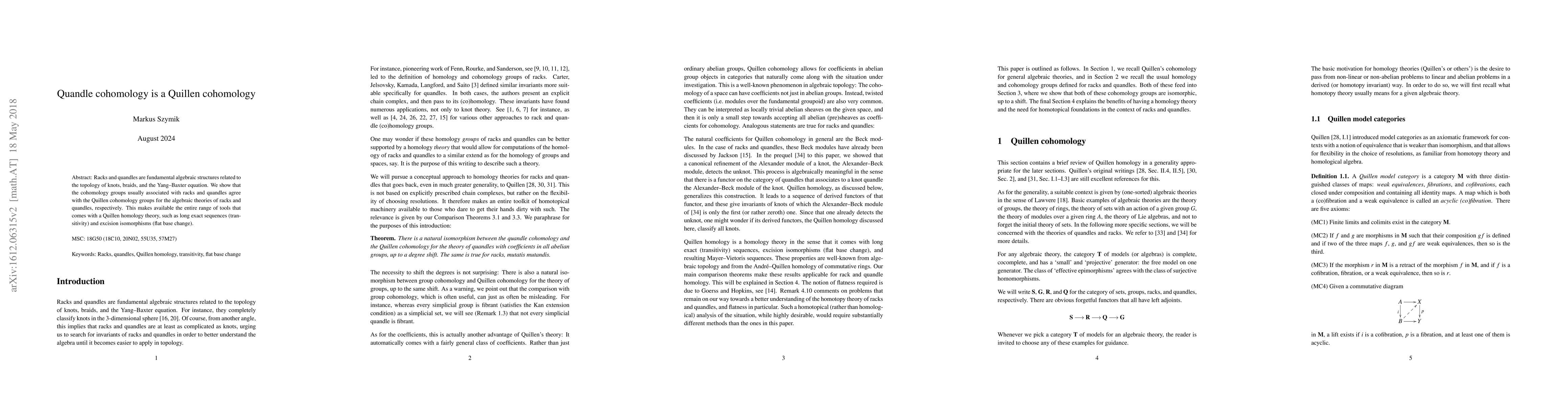 Summary: This paper demonstrates that quandle cohomology aligns with Quillen cohomology for racks and quandles, providing access to advanced tools like long exact sequences and excision isomorphisms.