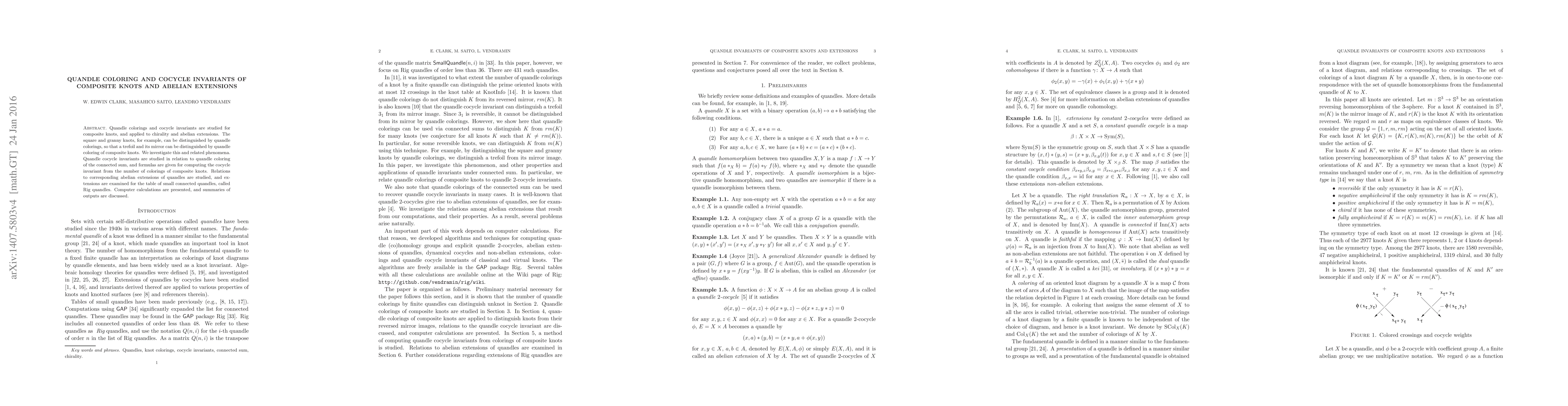 This paper explores quandle colorings and cocycle invariants for composite knots, demonstrating their ability to distinguish chiral knots like the trefoil and its mirror. It investigates the connected sum and provides formulas for computing cocycle invariants, linking these invariants to abelian extensions of quandles and analyzing small connected quandles called Rig quandles.
