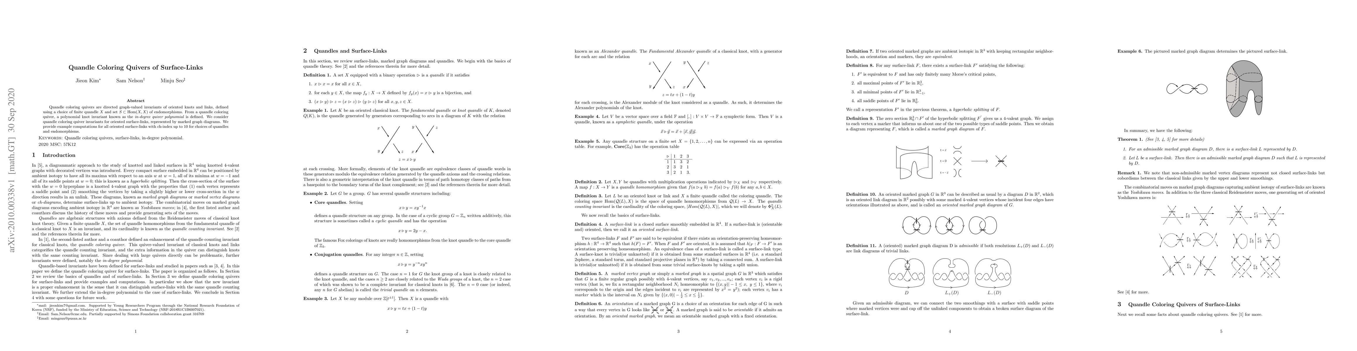 This paper explores quandle coloring quivers as directed graph invariants for oriented surface-links, defining an associated polynomial knot invariant. It includes example computations for surface-links with a crossing number index up to 10 using various quandles and endomorphisms.