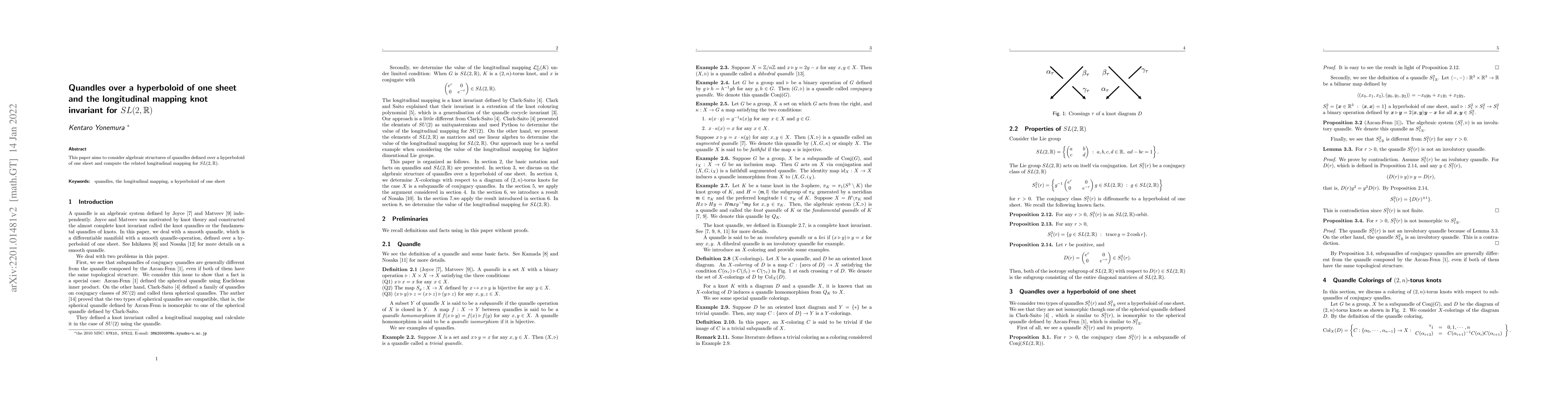 This paper aims to consider algebraic structures of quandles defined over a hyperboloid of one sheet and compute the related longitudinal mapping for $SL(2,\mathbb{R})$.