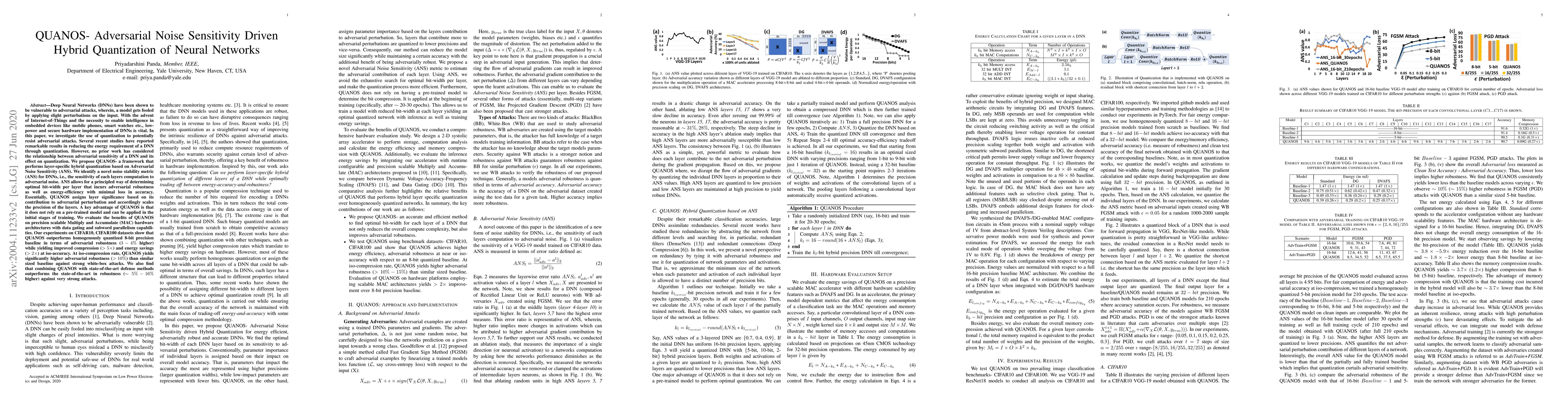 The research introduces QUANOS, a framework for layer-specific hybrid quantization of Deep Neural Networks (DNNs) based on Adversarial Noise Sensitivity (ANS). QUANOS assigns precision levels to layers according to their vulnerability to adversarial attacks, enhancing robustness, energy efficiency, and compression while maintaining accuracy. Evaluations on CIFAR10 and CIFAR100 datasets demonstrate that QUANOS outperforms traditional 8-bit quantization in terms of adversarial robustness, compression, and energy savings.