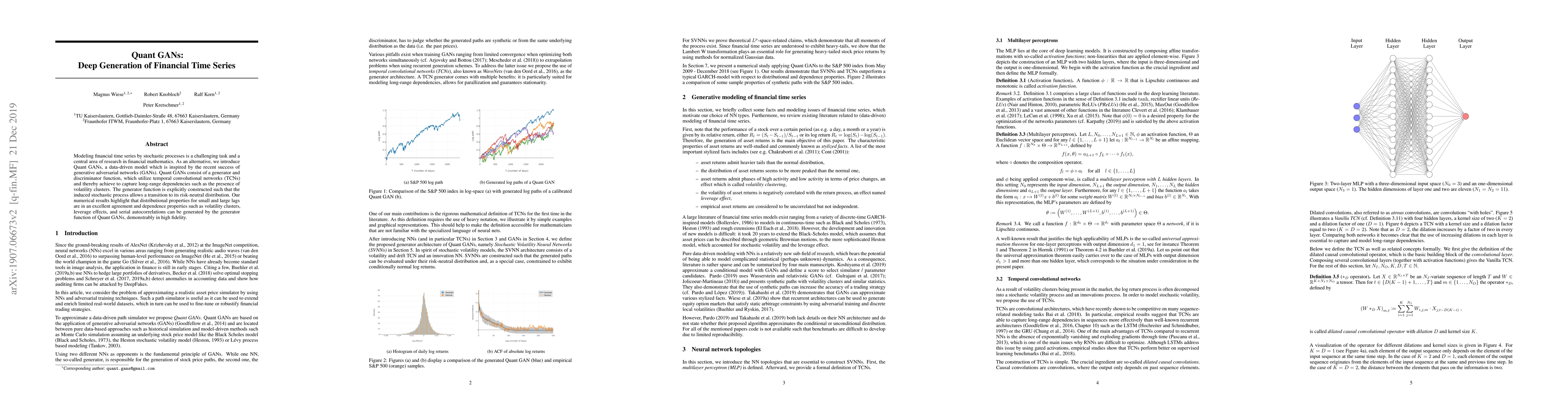 Modeling financial time series by stochastic processes is a challenging task and a central area of research in financial mathematics. As an alternative, we introduce Quant GANs, a data-driven model which is inspired by the recent success of generative adversarial networks (GANs). Quant GANs consist of a generator and discriminator function, which utilize temporal convolutional networks (TCNs) and thereby achieve to capture long-range dependencies such as the presence of volatility clusters. The generator function is explicitly constructed such that the induced stochastic process allows a transition to its risk-neutral distribution. Our numerical results highlight that distributional properties for small and large lags are in an excellent agreement and dependence properties such as volatility clusters, leverage effects, and serial autocorrelations can be generated by the generator function of Quant GANs, demonstrably in high fidelity.