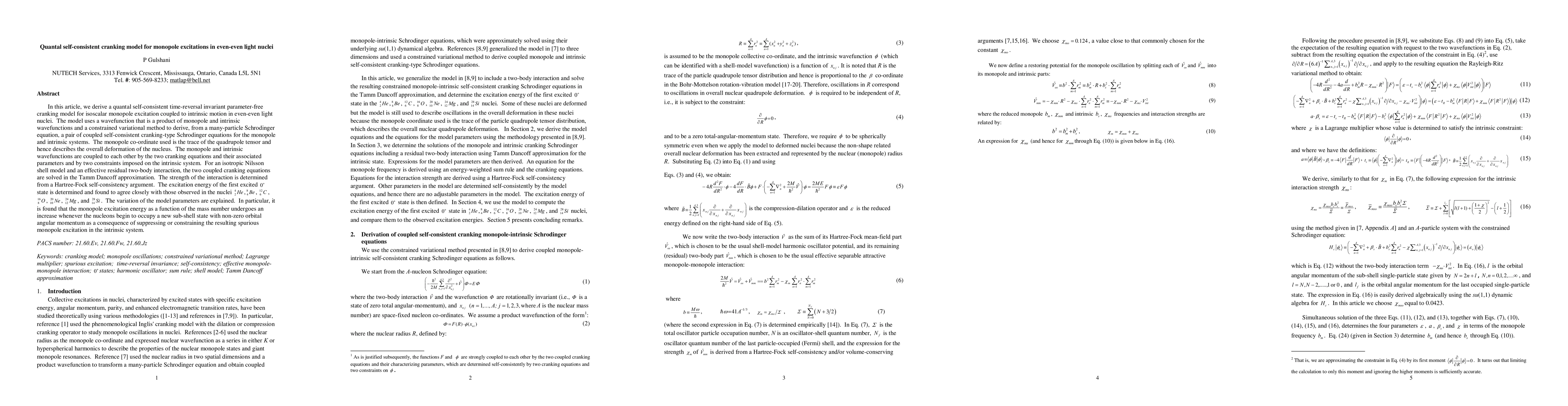 In this article, we derive a quantal self-consistent time-reversal invariant parameter-free cranking model for isoscalar monopole excitation coupled to intrinsic motion in even-even light nuclei. The model uses a wavefunction that is a product of monopole and intrinsic wavefunctions and a constrained variational method to derive, from a many-particle Schrodinger equation, a pair of coupled self-consistent cranking-type Schrodinger equations for the monopole and intrinsic systems. The monopole co-ordinate used is the trace of the quadrupole tensor and hence describes the overall deformation of the nucleus. The monopole and intrinsic wavefunctions are coupled to each other by the two cranking equations and their associated parameters and by two constraints imposed on the intrinsic system. For an isotropic Nilsson shell model and an effective residual two-body interaction, the two coupled cranking equations are solved in the Tamm Dancoff approximation. The strength of the interaction is determined from a Hartree-Fock self-consistency argument. The excitation energy of the first excited state is determined and found to agree closely with those observed in the nuclei He-4, Be-8, C-12, O-16 , Ne-20, Mg-24, and Si-28. The variation of the model parameters are explained. In particular, it is found that the monopole excitation energy as a function of the mass number undergoes an increase whenever the nucleons begin to occupy a new sub-shell state with non-zero orbital angular momentum as a consequence of suppressing or constraining the resulting spurious monopole excitation in the intrinsic system.