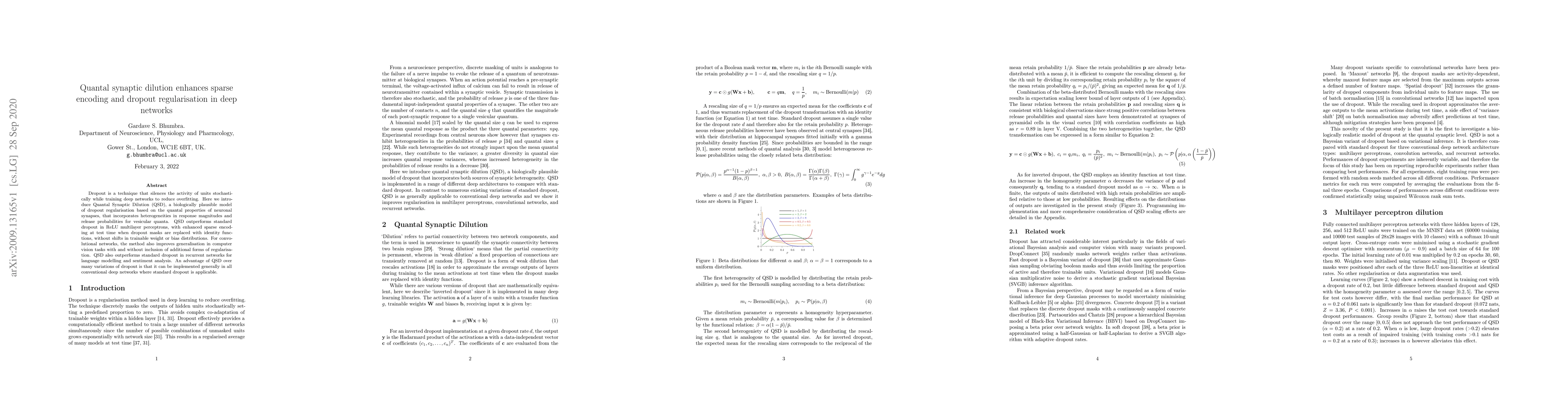 Dropout is a technique that silences the activity of units stochastically while training deep networks to reduce overfitting. Here we introduce Quantal Synaptic Dilution (QSD), a biologically plausible model of dropout regularisation based on the quantal properties of neuronal synapses, that incorporates heterogeneities in response magnitudes and release probabilities for vesicular quanta. QSD outperforms standard dropout in ReLU multilayer perceptrons, with enhanced sparse encoding at test time when dropout masks are replaced with identity functions, without shifts in trainable weight or bias distributions. For convolutional networks, the method also improves generalisation in computer vision tasks with and without inclusion of additional forms of regularisation. QSD also outperforms standard dropout in recurrent networks for language modelling and sentiment analysis. An advantage of QSD over many variations of dropout is that it can be implemented generally in all conventional deep networks where standard dropout is applicable.