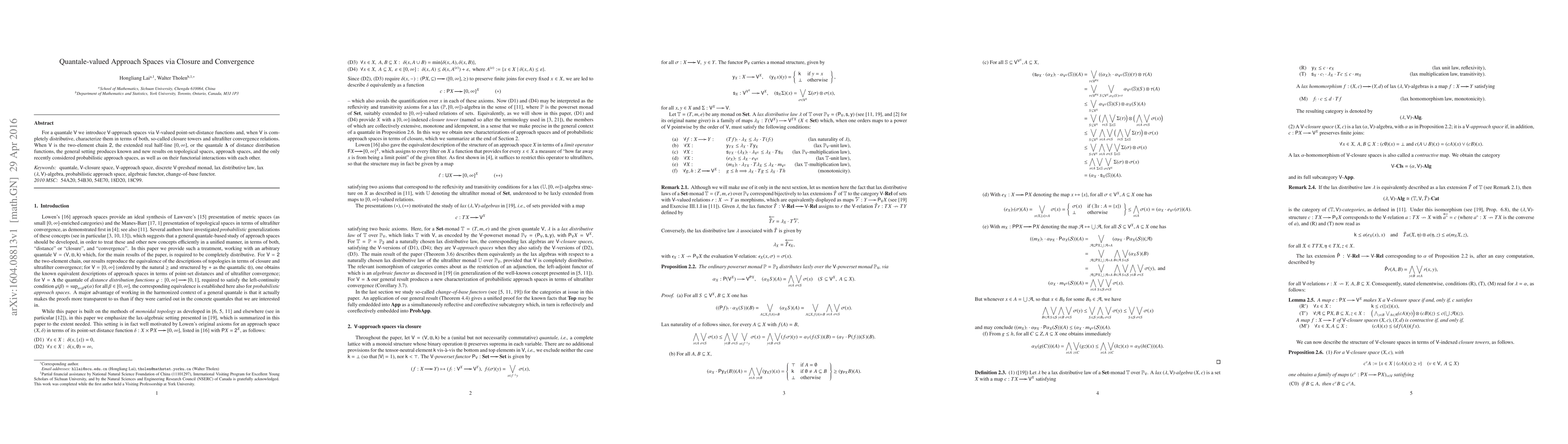 This paper introduces $\mathsf{V}$-approach spaces using $\mathsf{V}$-valued point-set-distance functions and characterizes them through closure towers and ultrafilter convergence relations when $\mathsf{V}$ is completely distributive, yielding results on topological spaces, traditional approach spaces, and probabilistic approach spaces.