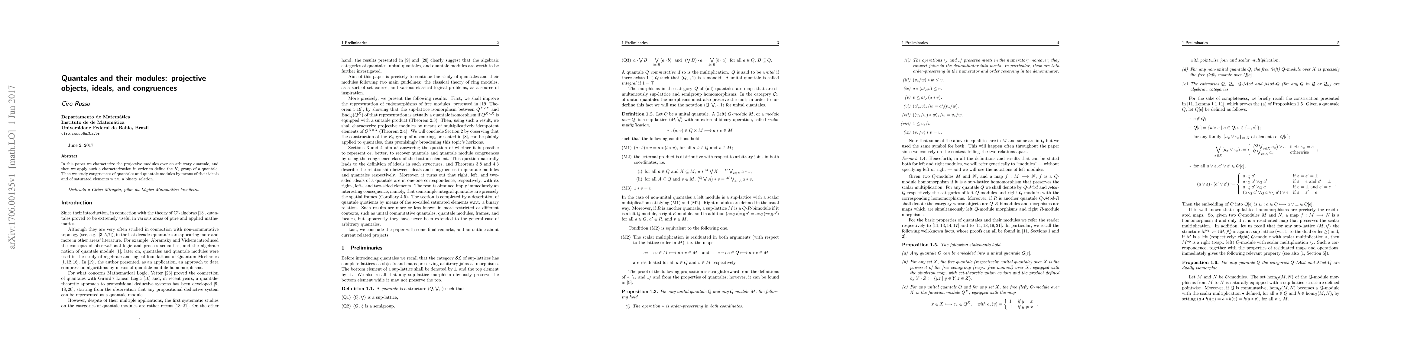 This paper characterizes projective modules over quantales, defining the K_0 group of a quantale, and studies congruences through ideals and binary relations, with implications for understanding quantale structures.