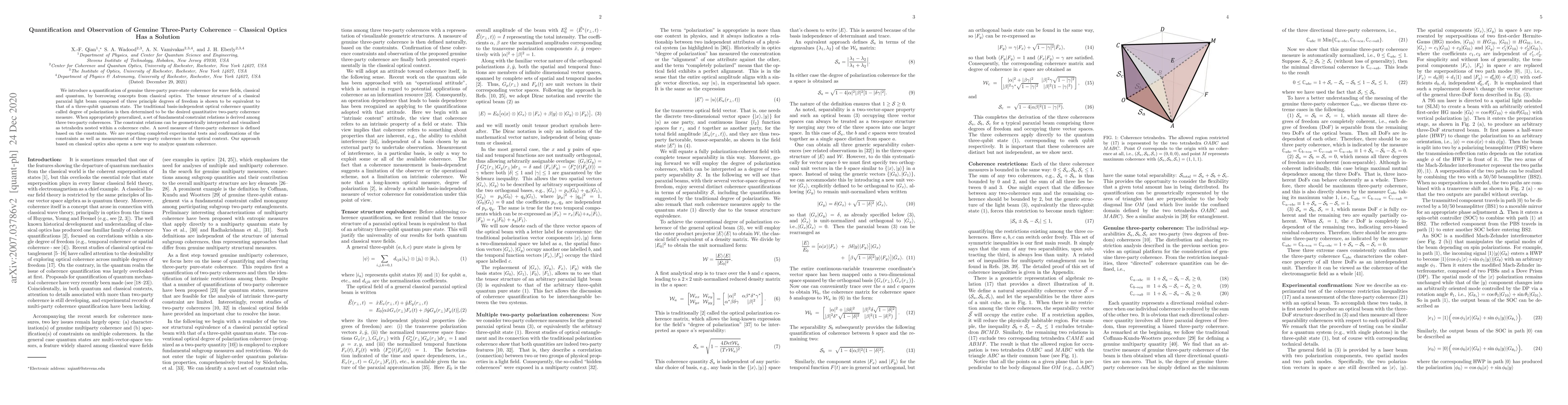 We introduce a quantification of genuine three-party pure-state coherence for wave fields, classical and quantum, by borrowing concepts from classical optics. The tensor structure of a classical paraxial light beam composed of three principle degrees of freedom is shown to be equivalent to that of a three-qubit quantum state. The traditional basis-independent optical coherence quantity called degree of polarization is then determined to be the desired quantitative two-party coherence measure. When appropriately generalized, a set of fundamental constraint relations is derived among three two-party coherences. The constraint relations can be geometrically interpreted and visualized as tetrahedra nested within a coherence cube. A measure of three-party coherence is defined based on the constraints. We are reporting completed experimental tests and confirmations of the constraints as well as measurement of three-party coherence in the optical context. Our approach based on classical optics also opens an alternative way to analyze quantum coherence.
