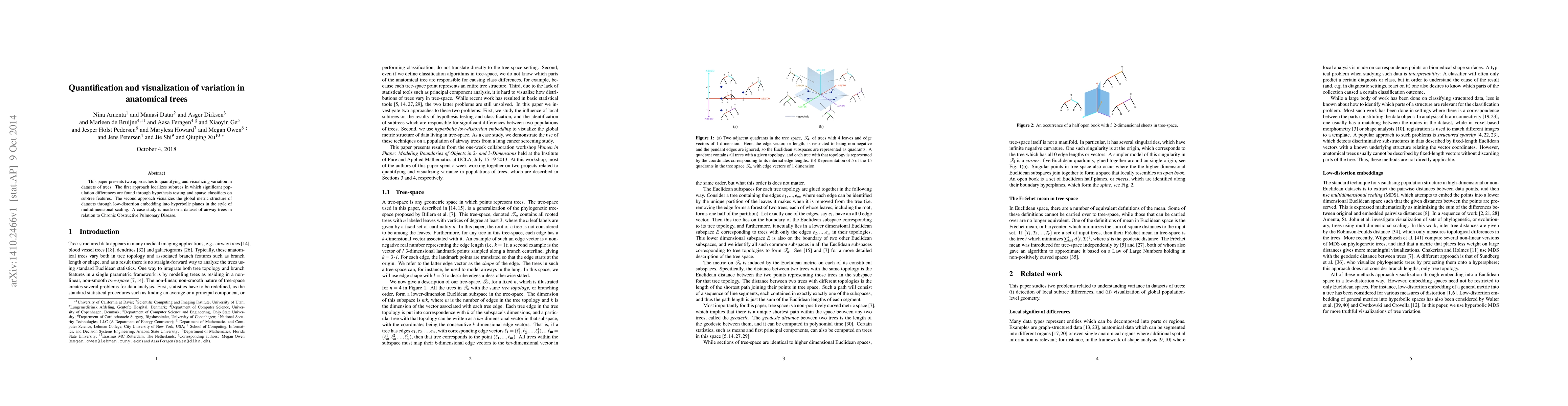 This paper presents two approaches to quantifying and visualizing variation in datasets of trees. The first approach localizes subtrees in which significant population differences are found through hypothesis testing and sparse classifiers on subtree features. The second approach visualizes the global metric structure of datasets through low-distortion embedding into hyperbolic planes in the style of multidimensional scaling. A case study is made on a dataset of airway trees in relation to Chronic Obstructive Pulmonary Disease.