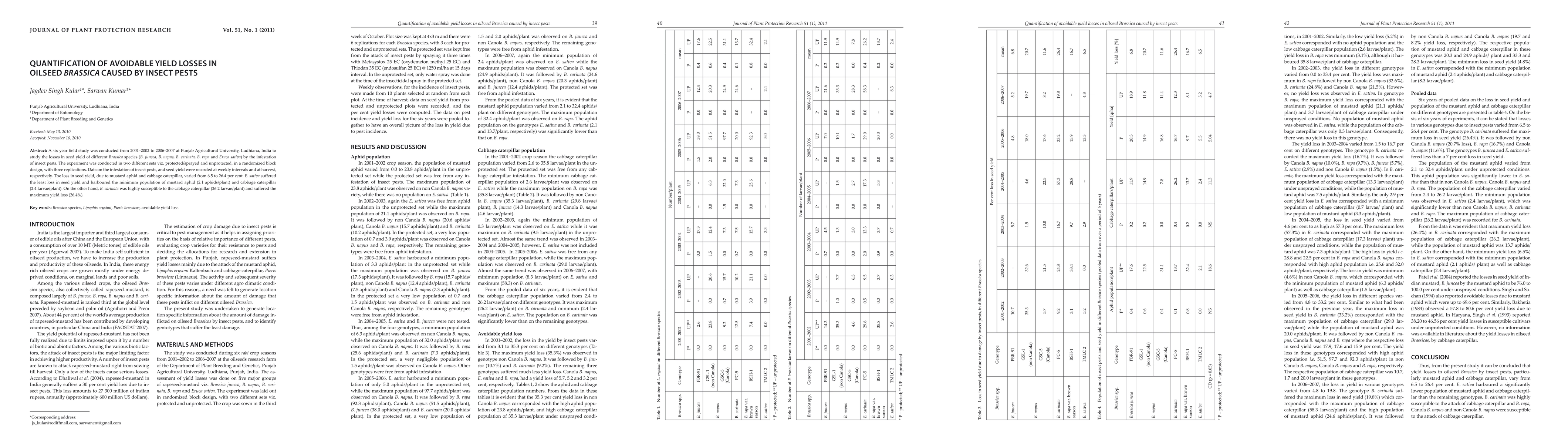 A six year field study was conducted from 2001 2002 to 2006 2007 at Punjab Agricultural University, Ludhiana, India to study the losses in seed yield of different Brassica species (B. juncea, B. napus, B. carinata, B. rapa and Eruca sativa) by the infestation of insect pests. The experiment was conducted in two different sets viz. protected/sprayed and unprotected, in a randomized block design, with three replications. Data on the infestation of insect pests, and seed yield were recorded at weekly intervals and at harvest, respectively. The loss in seed yield, due to mustard aphid and cabbage caterpillar, varied from 6.5 to 26.4 per cent. E. sativa suffered the least loss in seed yield and harboured the minimum population of mustard aphid (2.1 aphids/plant) and cabbage caterpillar (2.4 larvae/plant). On the other hand, B. carinata was highly susceptible to the cabbage caterpillar (26.2 larvae/plant) and suffered the maximum yield loss (26.4%).