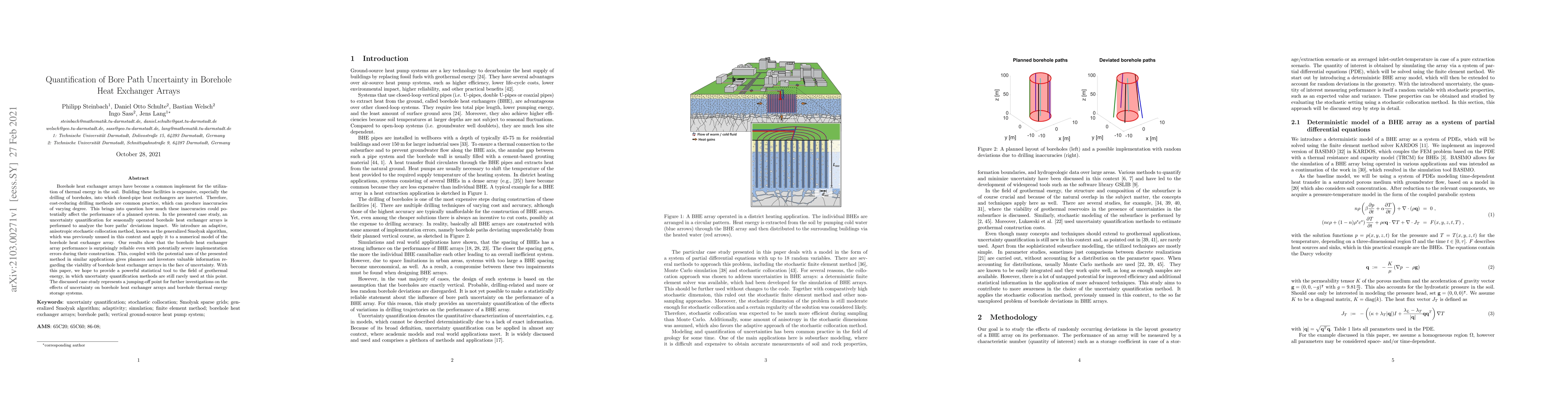 This paper quantifies uncertainty in bore paths for borehole heat exchanger arrays using an adaptive, anisotropic stochastic collocation method. Despite potential construction inaccuracies, the study finds that array performance remains reliable, offering valuable insights for geothermal energy planners and investors.