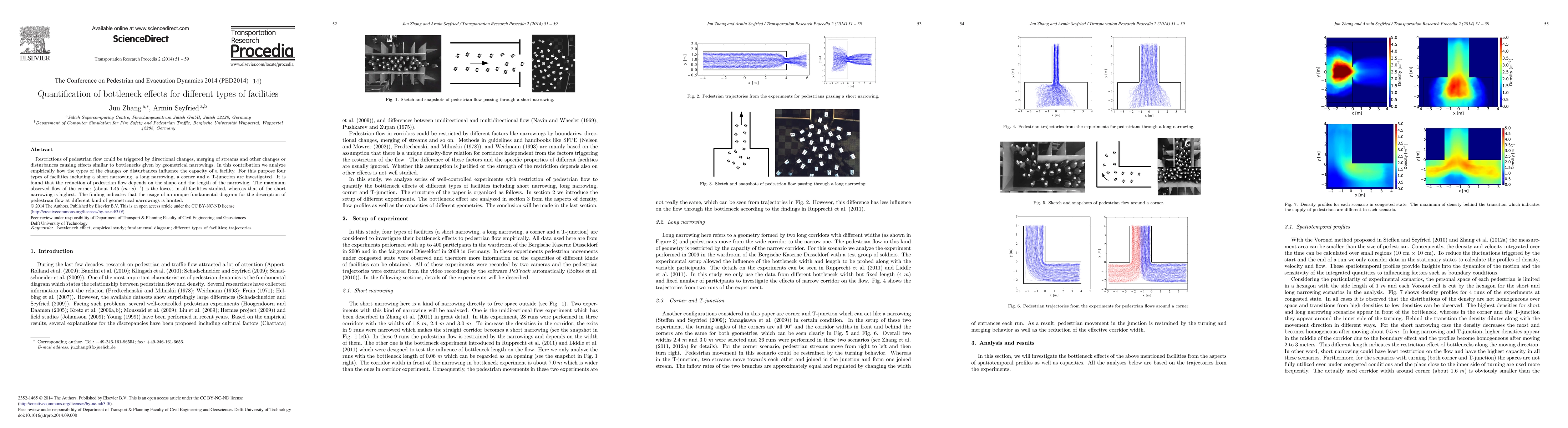 This study empirically investigates how different types of pedestrian flow disturbances, such as directional changes and merging streams, affect facility capacity. The research finds that pedestrian flow reduction varies with the shape and length of geometrical narrowings, with corners showing the lowest maximum flow and short narrowings the highest.