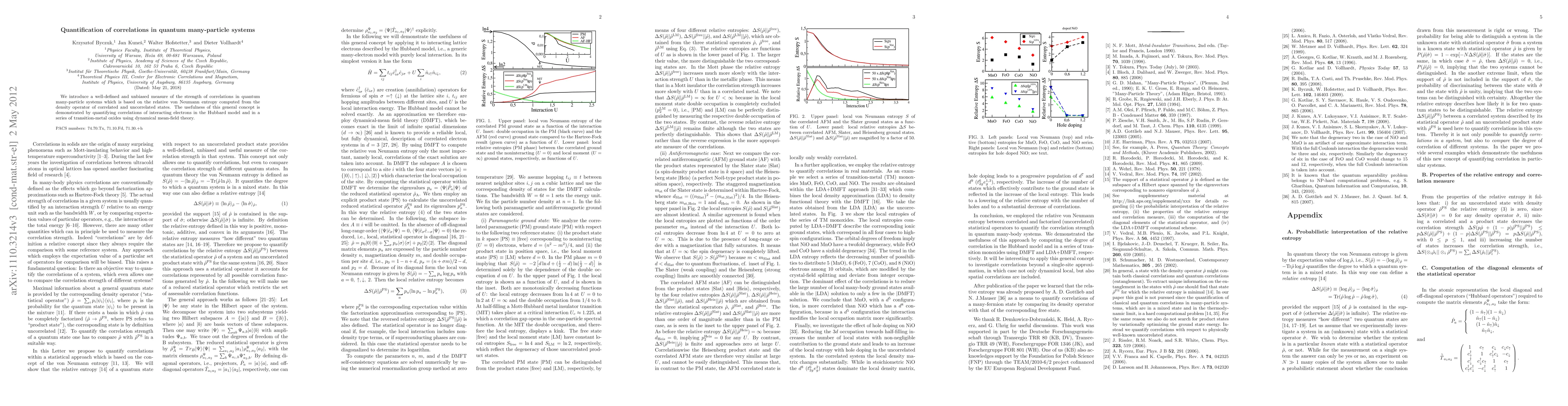 This paper proposes a new measure for quantifying correlations in quantum many-particle systems using relative von Neumann entropy. It applies this measure to the Hubbard model and transition-metal oxides to demonstrate its effectiveness.