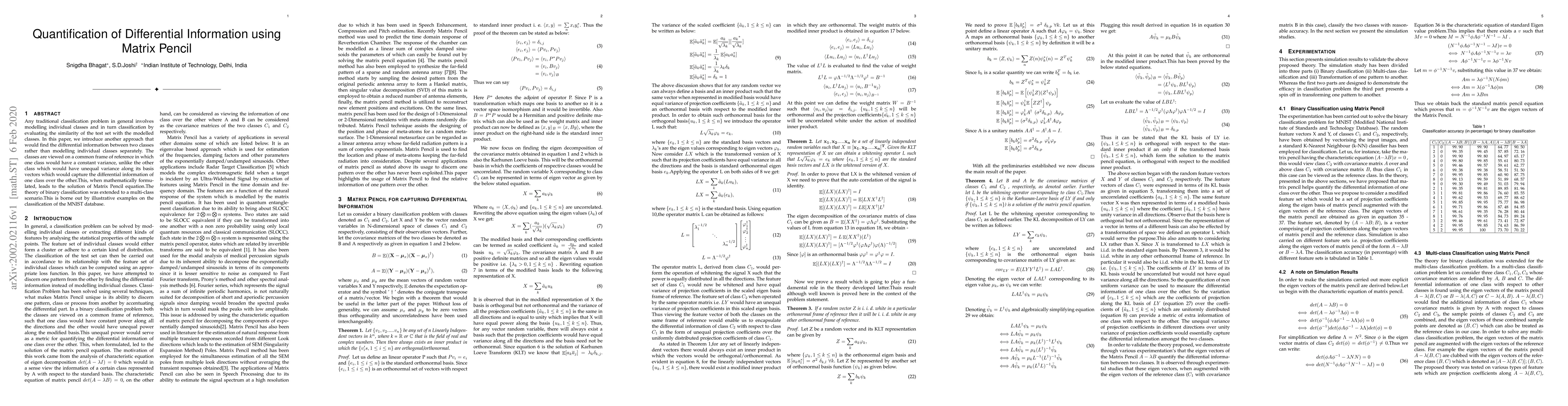 Any traditional classification problem in general involves modelling individual classes and in turn classification by evaluating the similarity of the test set with the modelled classes. In this paper, we introduce another approach that would find the differential information between two classes rather than modelling individual classes separately. The classes are viewed on a common frame of reference in which one class would have a constant variance, unlike the other class which would have unequal variance along its basis vectors which would capture the differential information of one class over the other.This, when mathematically formulated, leads to the solution of Matrix Pencil equation.The theory of binary classification was extended to a multi-class scenario.This is borne out by illustrative examples on the classification of the MNIST database.