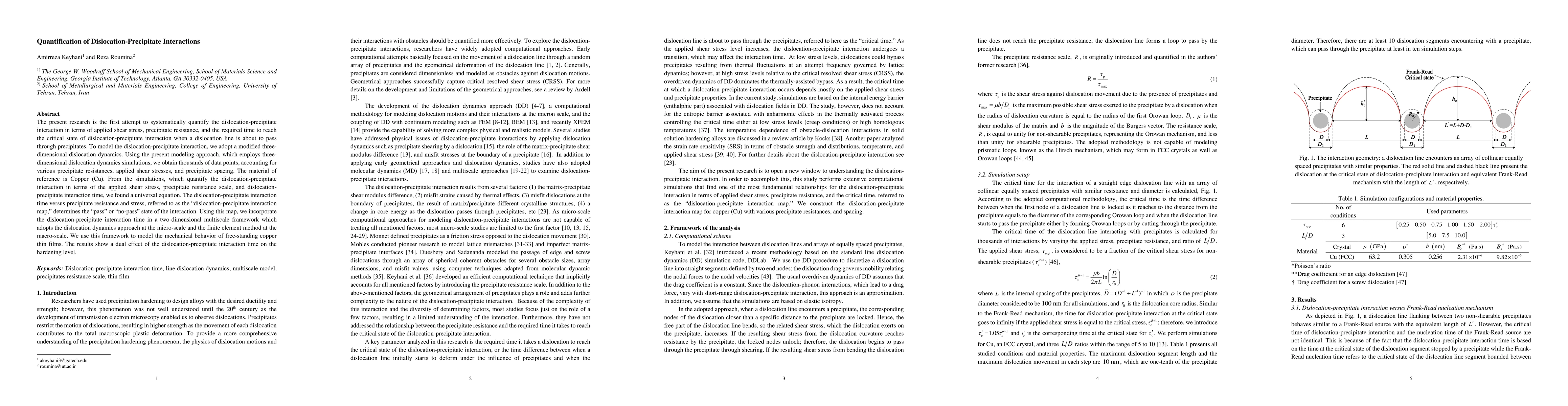 This research systematically quantifies dislocation-precipitate interactions in Copper using a modified three-dimensional dislocation dynamics model, revealing a universal equation that predicts interaction time based on applied shear stress and precipitate resistance. The findings inform a two-dimensional multiscale framework that models the mechanical behavior of copper thin films, showing the dual effect of interaction time on hardening.
