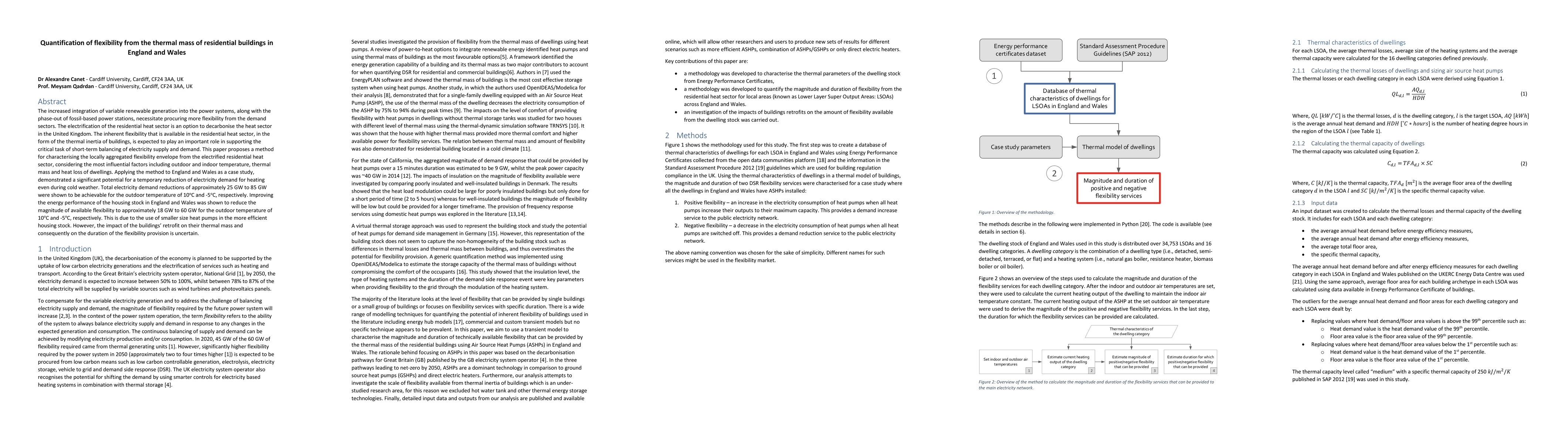 This paper proposes a method to quantify the flexibility from the thermal mass of residential buildings in England and Wales, showing significant potential for temporary electricity demand reductions during cold weather. Improved housing efficiency reduces flexibility, but the impact of retrofitting on thermal mass remains uncertain.