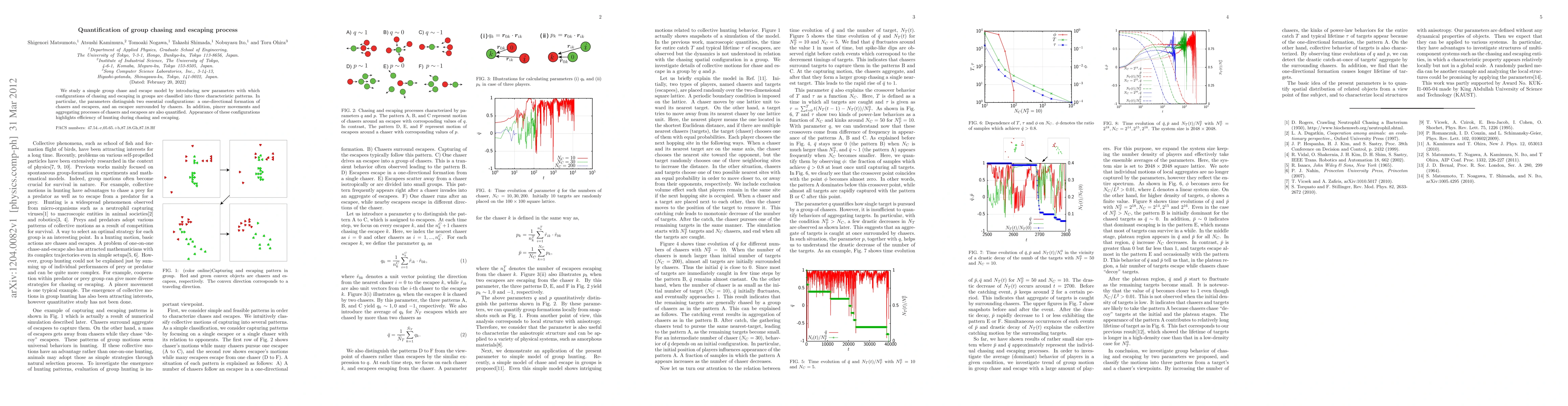 We study a simple group chase and escape model by introducing new parameters with which configurations of chasing and escaping in groups are classified into three characteristic patterns. In particular, the parameters distinguish two essential configurations: a one-directional formation of chasers and escapees, and an escapee surrounded by chasers. In addition, pincer movements and aggregating processes of chasers and escapees are also quantified. Appearance of these configurations highlights efficiency of hunting during chasing and escaping.