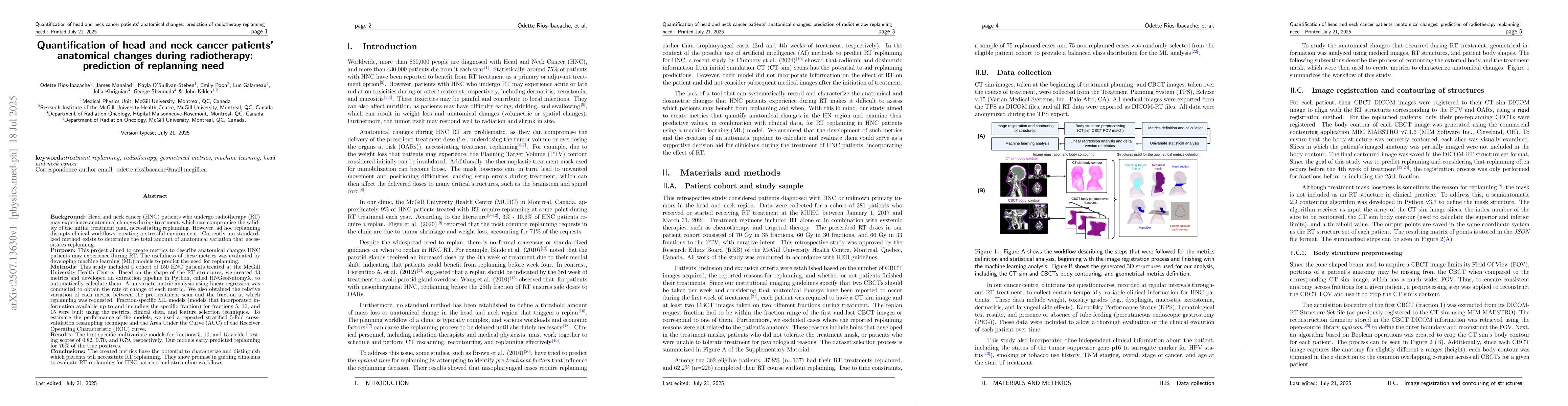 Head and neck cancer (HNC) patients who undergo radiotherapy (RT) may experience anatomical changes during treatment, compromising the validity of the initial treatment plan, necessitating replanning. However, replanning disrupts clinical workflows, creating a stressful environment. Currently, no standardized method exists to determine the total amount of anatomical change that necessitates replanning. This project aimed to create metrics to describe anatomical changes HNC patients may experience during RT and develop machine learning (ML) models to predict RT replanning. We included a cohort of 150 HNC patients treated at the McGill University Health Centre. Based on the shape of the RT structures, we created metrics and developed an extraction pipeline, called HNGeoNatomyX, to automatically calculate them. A univariate metric analysis using linear regression was conducted to obtain the rate of change of each metric. We also obtained the relative variation of each metric between the pre-treatment scan and the fraction at which replanning was requested. Fraction-specific ML models (models that incorporated information available up to and including the specific fraction) for fractions 5, 10, and 15 were built using the metrics, clinical data, and feature selection techniques. To estimate models' performance, we used a repeated stratified 5-fold cross-validation resampling technique and the Area Under the Curve (AUC) of the Receiver Operating Characteristic (ROC) curve. The best specific multivariate models for fractions 5, 10, and 15 yielded testing scores of 0.82, 0.70, and 0.79, respectively. Our models early predicted replanning for 76% of the true positives. The created metrics have the potential to characterize and distinguish which patients will necessitate RT replanning. They show promise in guiding clinicians to evaluate RT replanning for HNC patients and streamline workflows.
