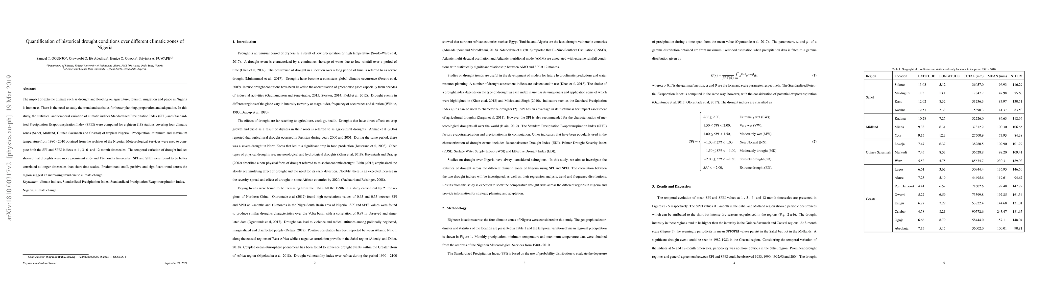 The impact of extreme climate such as drought and flooding on agriculture, tourism, migration and peace in Nigeria is immense. There is the need to study the trend and statistics for better planning, preparation and adaptation. In this study, the statistical and temporal variation of climatic indices Standardized Precipitation Index (SPI ) and Standardized Precipitation Evapotranspiration Index (SPEI) were computed for eighteen (18) stations covering four climatic zones (Sahel, Midland, Guinea Savannah and Coastal) of tropical Nigeria. Precipitation, minimum and maximum temperature from 1980 - 2010 obtained from the archives of the Nigerian Meteorological Services were used to compute both the SPI and SPEI indices at 1-, 3- 6- and 12-month timescales. The temporal variation of drought indices showed that droughts were more prominent at 6- and 12-months timescales. SPI and SPEI were found to be better correlated at longer timescales than short time scales. Predominant small, positive and significant trend across the region suggest an increasing trend due to climate change.