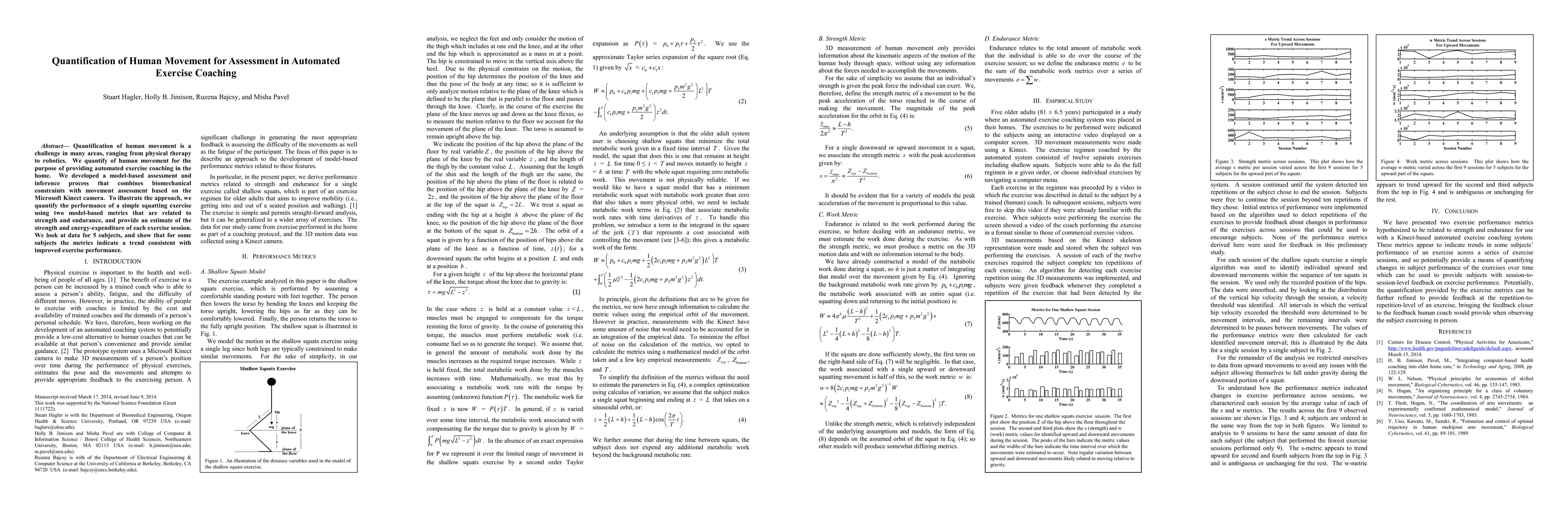 Quantification of human movement is a challenge in many areas, ranging from physical therapy to robotics. We quantify of human movement for the purpose of providing automated exercise coaching in the home. We developed a model-based assessment and inference process that combines biomechanical constraints with movement assessment based on the Microsoft Kinect camera. To illustrate the approach, we quantify the performance of a simple squatting exercise using two model-based metrics that are related to strength and endurance, and provide an estimate of the strength and energy-expenditure of each exercise session. We look at data for 5 subjects, and show that for some subjects the metrics indicate a trend consistent with improved exercise performance.