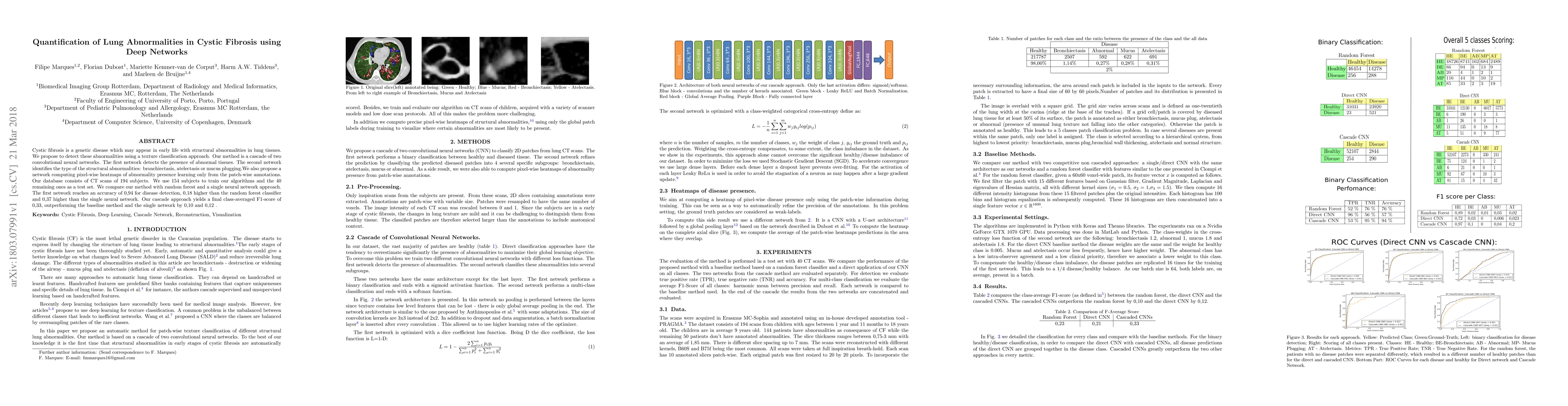 This paper proposes a two-stage convolutional neural network approach to detect and classify lung abnormalities in cystic fibrosis patients using CT scans. The method outperforms random forest and single neural network baselines, achieving higher accuracy and F1-score in identifying specific structural abnormalities.