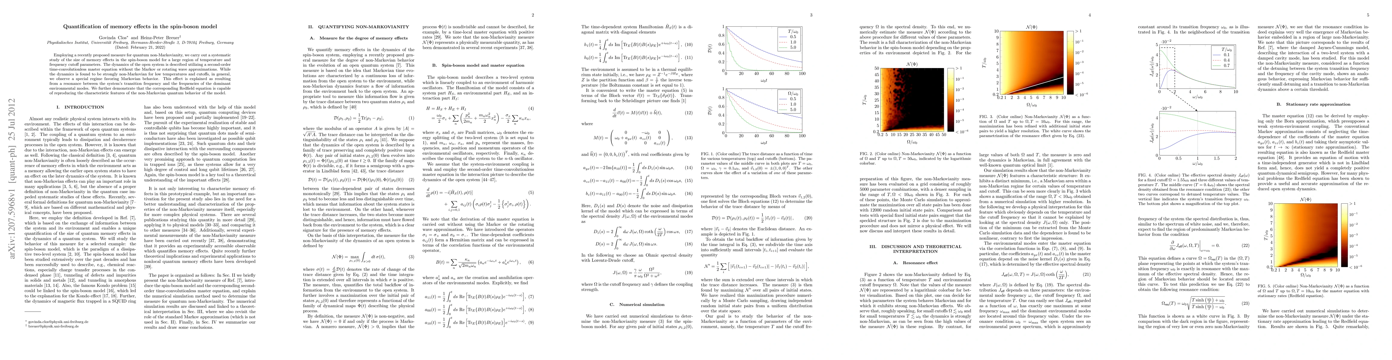 This paper quantifies memory effects in the spin-boson model using a new measure for quantum non-Markovianity, revealing strong non-Markovianity at low temperatures and cutoffs. A special regime favoring Markovian behavior is observed due to resonance between system and environmental frequencies, with the Redfield equation capturing the non-Markovian dynamics.