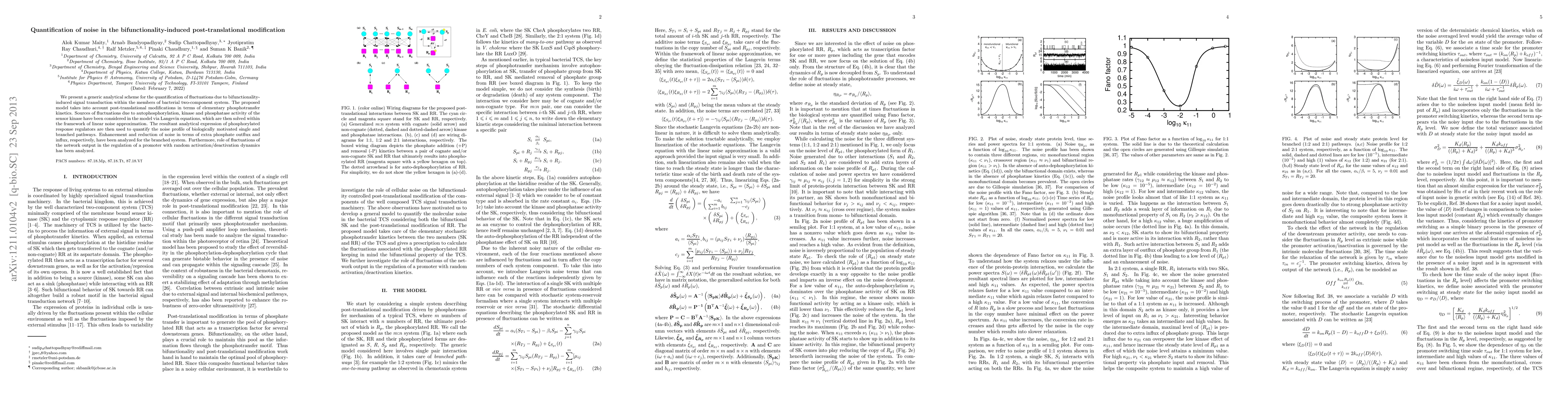 We present a generic analytical scheme for the quantification of fluctuations due to bifunctionality-induced signal transduction within the members of bacterial two-component system. The proposed model takes into account post-translational modifications in terms of elementary phosphotransfer kinetics. Sources of fluctuations due to autophosphorylation, kinase and phosphatase activity of the sensor kinase have been considered in the model via Langevin equations, which are then solved within the framework of linear noise approximation. The resultant analytical expression of phosphorylated response regulators are then used to quantify the noise profile of biologically motivated single and branched pathways. Enhancement and reduction of noise in terms of extra phosphate outflux and influx, respectively, have been analyzed for the branched system. Furthermore, role of fluctuations of the network output in the regulation of a promoter with random activation/deactivation dynamics has been analyzed.