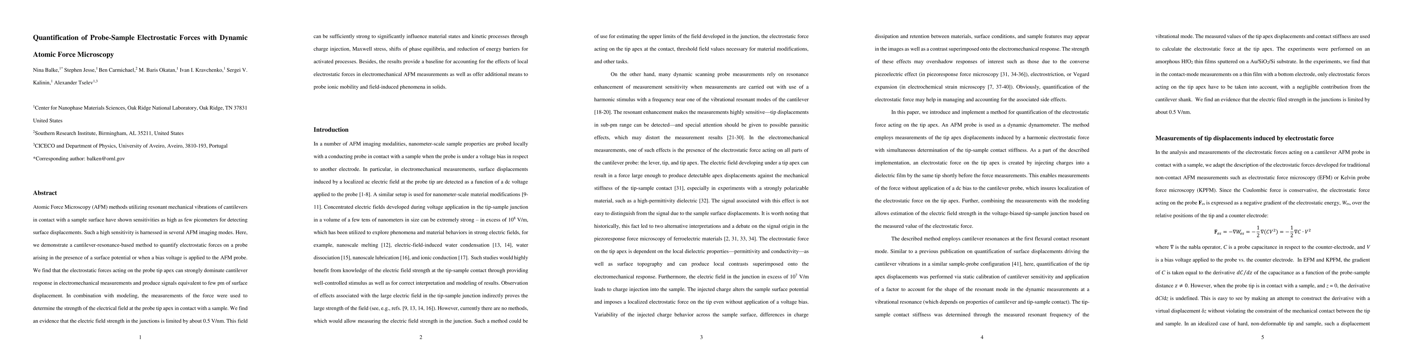 This paper presents a cantilever-resonance-based method to quantify electrostatic forces in atomic force microscopy (AFM), showing that these forces can dominate probe response and influence material states through charge injection and field-induced phenomena, with a measured electric field strength limit of approximately 0.5 V/nm.