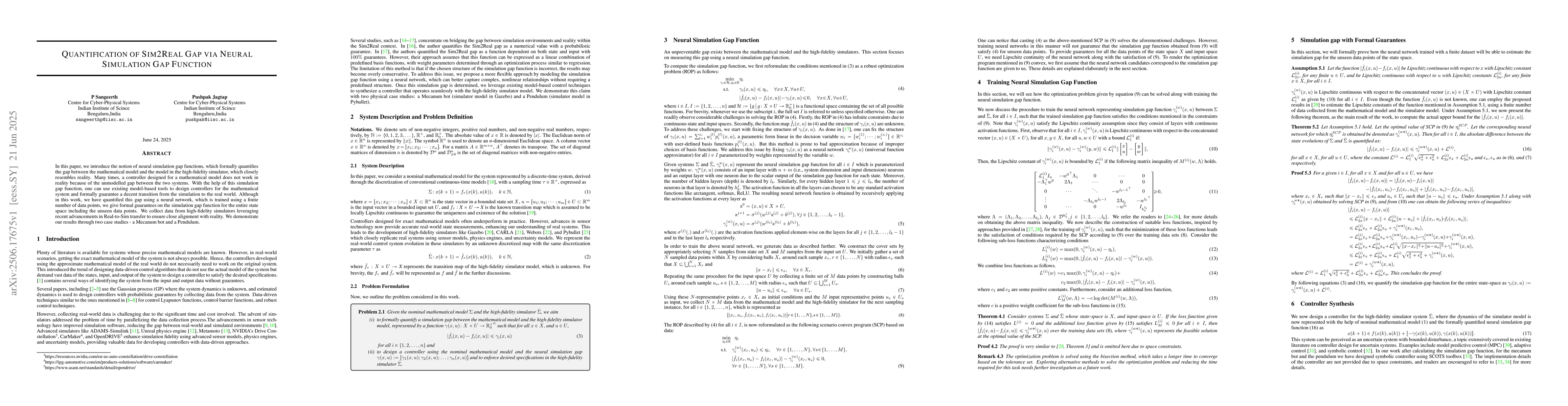 In this paper, we introduce the notion of neural simulation gap functions, which formally quantifies the gap between the mathematical model and the model in the high-fidelity simulator, which closely resembles reality. Many times, a controller designed for a mathematical model does not work in reality because of the unmodelled gap between the two systems. With the help of this simulation gap function, one can use existing model-based tools to design controllers for the mathematical system and formally guarantee a decent transition from the simulation to the real world. Although in this work, we have quantified this gap using a neural network, which is trained using a finite number of data points, we give formal guarantees on the simulation gap function for the entire state space including the unseen data points. We collect data from high-fidelity simulators leveraging recent advancements in Real-to-Sim transfer to ensure close alignment with reality. We demonstrate our results through two case studies - a Mecanum bot and a Pendulum.