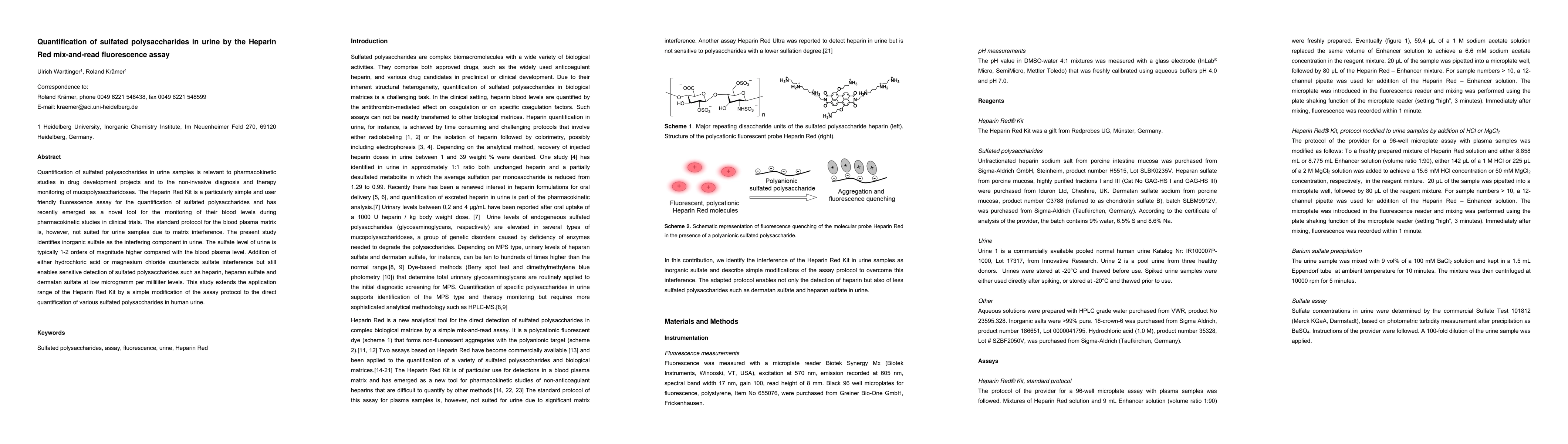 This study modifies the Heparin Red fluorescence assay to quantify sulfated polysaccharides in urine, addressing matrix interference from high inorganic sulfate levels. By adding hydrochloric acid or magnesium chloride, the assay can sensitively detect sulfated polysaccharides at low microgram per milliliter levels, expanding its application for pharmacokinetic studies and mucopolysaccharidoses monitoring.