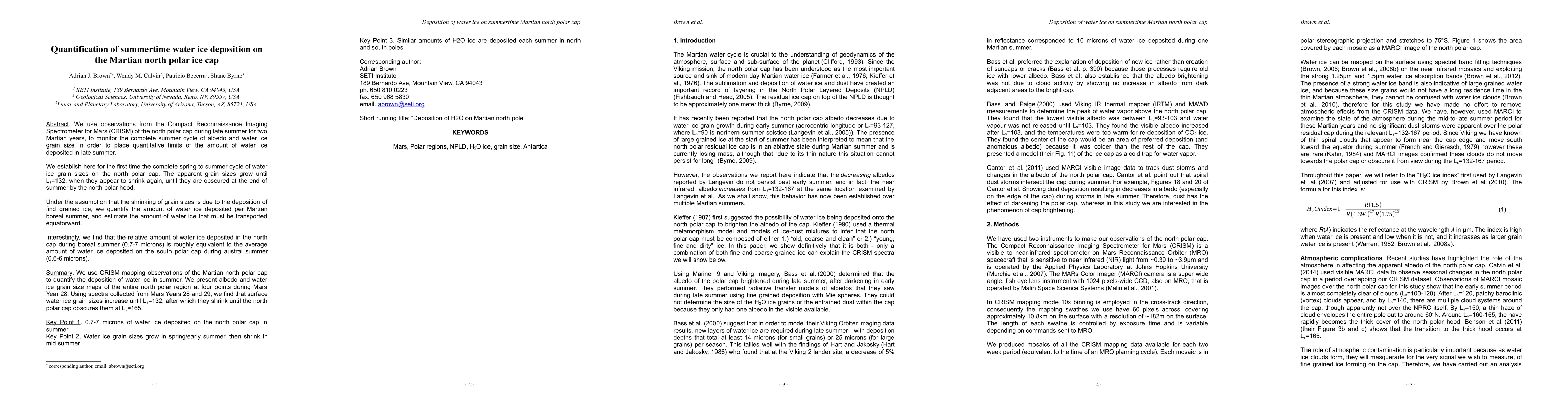 This study uses CRISM observations to quantify water ice deposition on Mars's north polar ice cap during summer, finding that the deposited ice grain sizes shrink due to fine-grained ice accumulation. The research estimates the amount of water ice deposited per Martian summer, revealing it is comparable to the south polar cap's austral summer deposition.