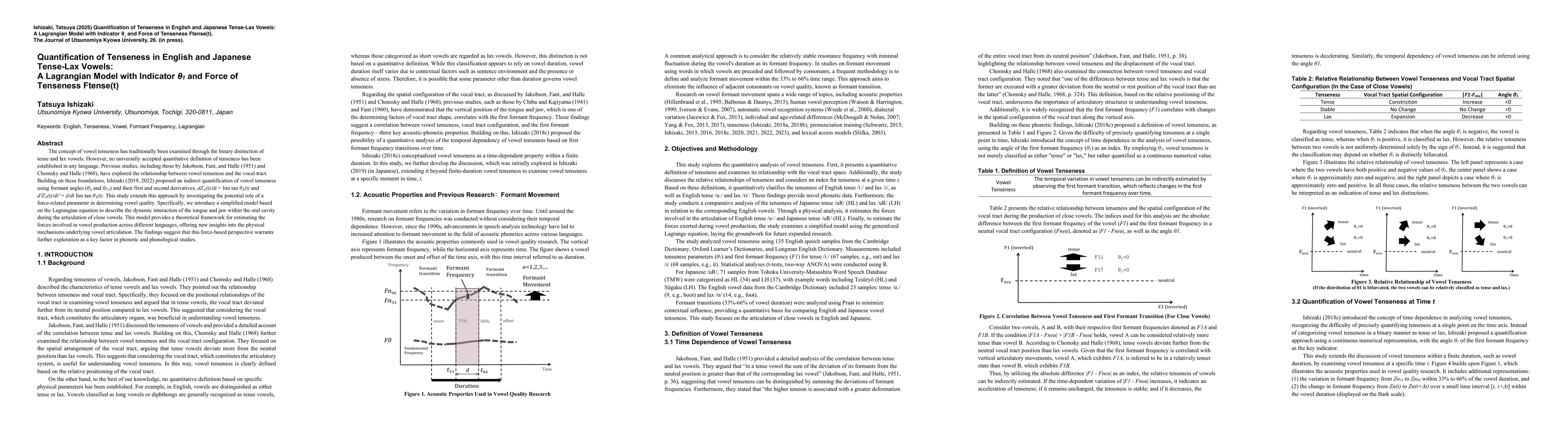 This work extends previous research by Ishizaki (2019, 2022) by proposing 'Force of Tenseness, Ftense(t)' as a novel determinant of vowel quality, supported by physical analysis and offering a theoretical framework for cross-linguistic comparisons.