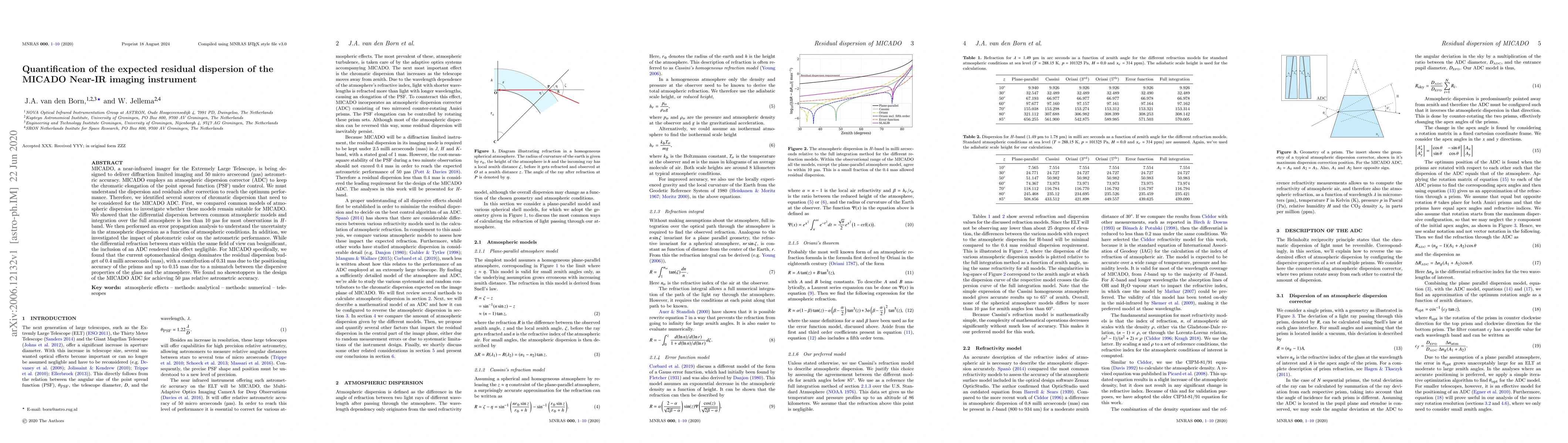 This paper quantifies the residual dispersion in the MICADO near-infrared imaging instrument, finding that the current optomechanical design contributes 0.4 milli arcseconds (mas) to the residual dispersion, with the positioning accuracy of the prisms and material mismatch adding further minor contributions. The study concludes that the design of the MICADO atmospheric dispersion corrector (ADC) is adequate for achieving the desired 50 micro arcsecond (μas) astrometric accuracy.