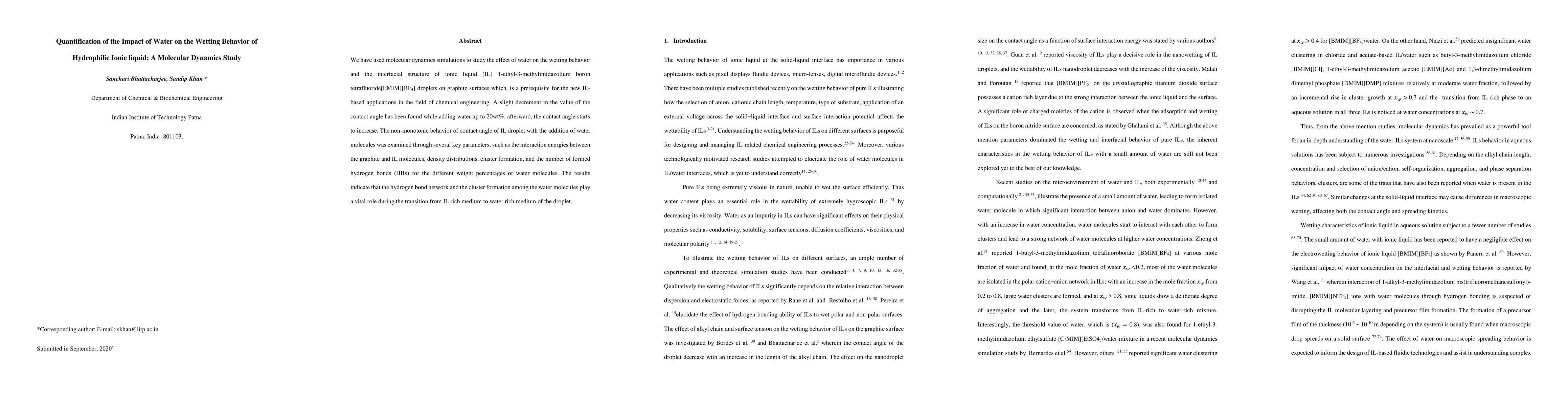 This study uses molecular dynamics simulations to analyze the effect of water on the wetting behavior of ionic liquid EMIM[BF4] on graphite surfaces. The contact angle decreases slightly with up to 20% water content but increases thereafter, highlighting the role of hydrogen bonding and cluster formation in the wetting transition.