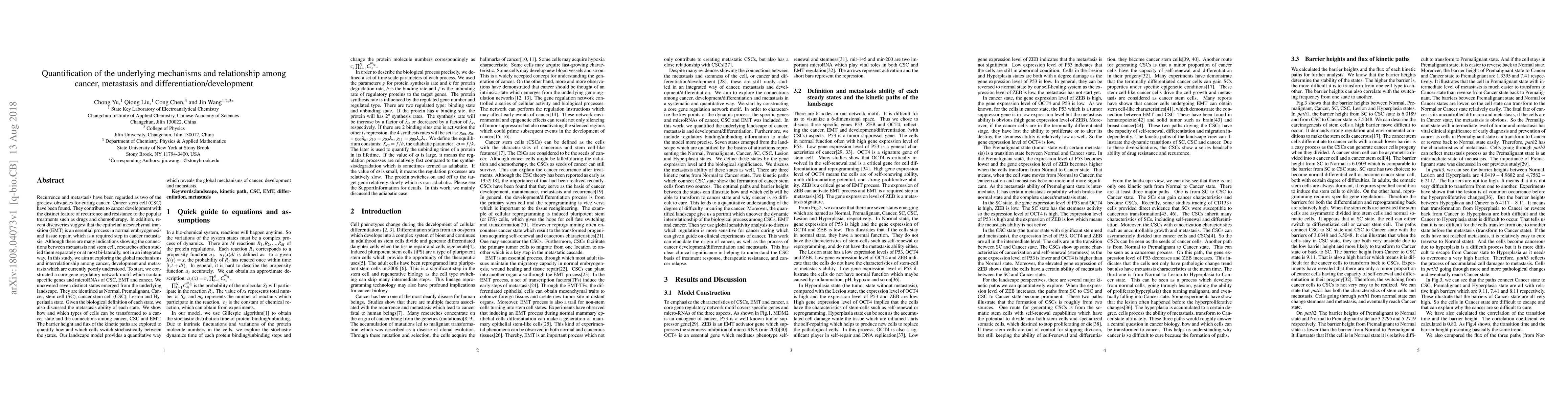 This study constructs a gene regulatory network to explore the mechanisms and relationships among cancer, metastasis, and differentiation. It identifies seven distinct states, including Normal, Cancer, and Cancer Stem Cell, and quantifies how cells transition between these states, providing insights into the global processes of cancer development and metastasis.