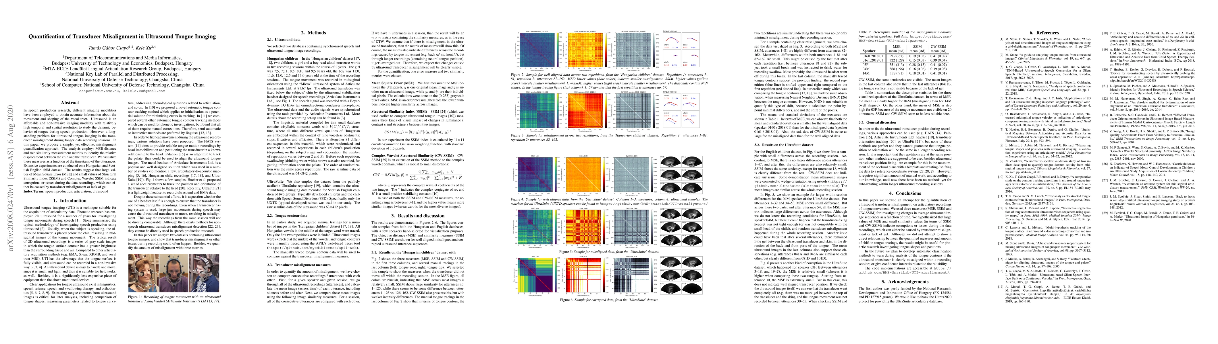 This paper proposes a method to quantify transducer misalignment in ultrasound tongue imaging using MSE, SSIM, and CW-SSIM metrics. Experiments on Hungarian and Scottish English child datasets show that high MSE and low SSIM/CW-SSIM values indicate potential recording issues due to misalignment or inadequate gel.