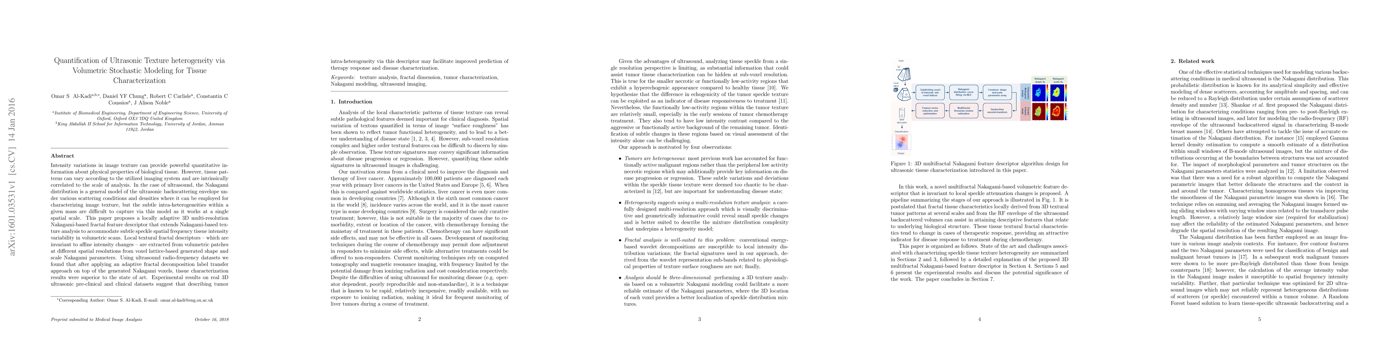 This paper introduces a locally adaptive 3D multi-resolution Nakagami-based fractal feature descriptor to quantify ultrasonic texture heterogeneity in tissue characterization. The proposed method enhances the Nakagami model to capture subtle intra-heterogeneities in volumetric scans, leading to superior tissue characterization and potential improvements in predicting therapy response.