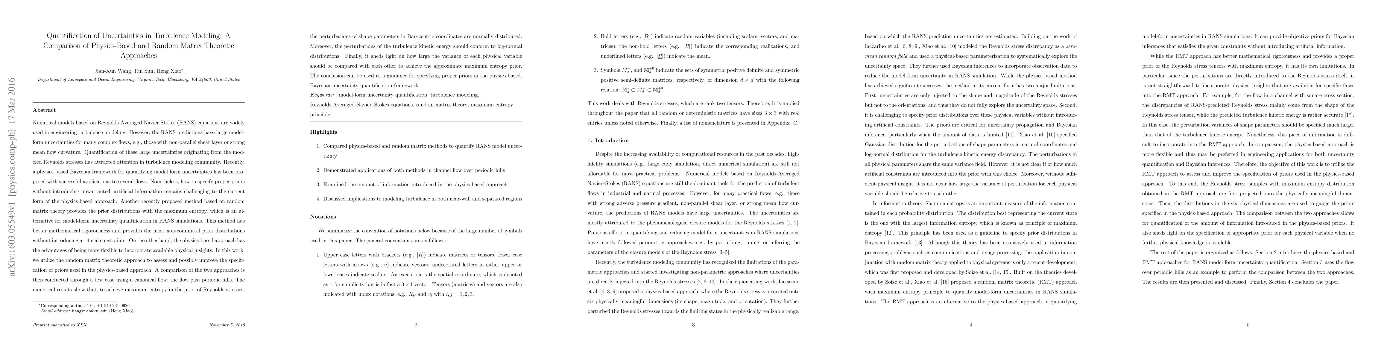 This paper compares physics-based and random matrix theoretic approaches to quantify uncertainties in turbulence modeling using Reynolds-Averaged Navier-Stokes (RANS) equations. It finds that the random matrix approach can guide the specification of priors in the physics-based Bayesian framework, suggesting normally distributed perturbations for shape parameters and log-normal distributions for turbulence kinetic energy.