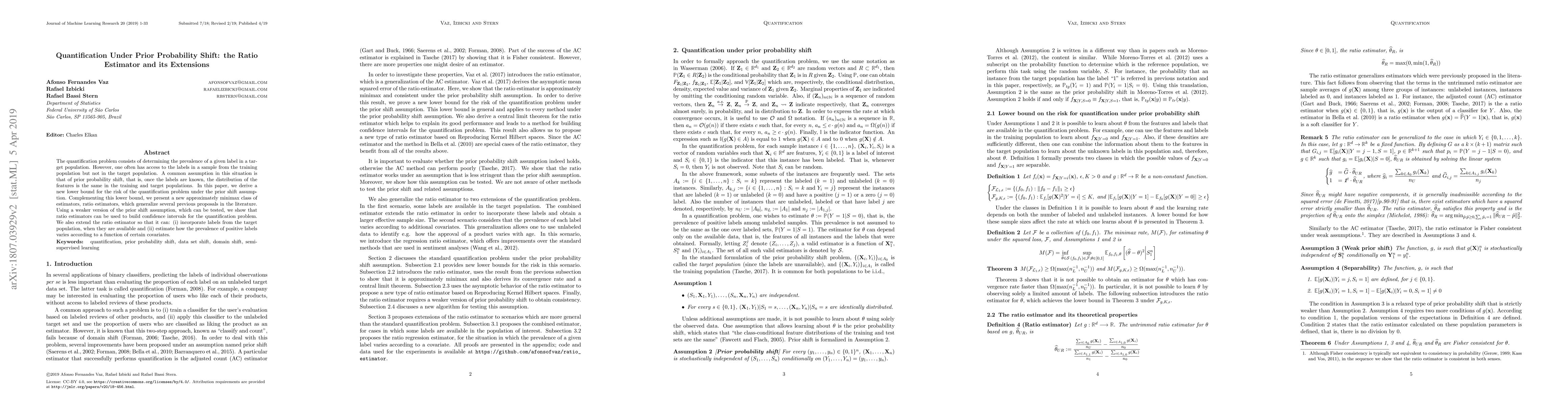 The quantification problem consists of determining the prevalence of a given label in a target population. However, one often has access to the labels in a sample from the training population but not in the target population. A common assumption in this situation is that of prior probability shift, that is, once the labels are known, the distribution of the features is the same in the training and target populations. In this paper, we derive a new lower bound for the risk of the quantification problem under the prior shift assumption. Complementing this lower bound, we present a new approximately minimax class of estimators, ratio estimators, which generalize several previous proposals in the literature. Using a weaker version of the prior shift assumption, which can be tested, we show that ratio estimators can be used to build confidence intervals for the quantification problem. We also extend the ratio estimator so that it can: (i) incorporate labels from the target population, when they are available and (ii) estimate how the prevalence of positive labels varies according to a function of certain covariates.