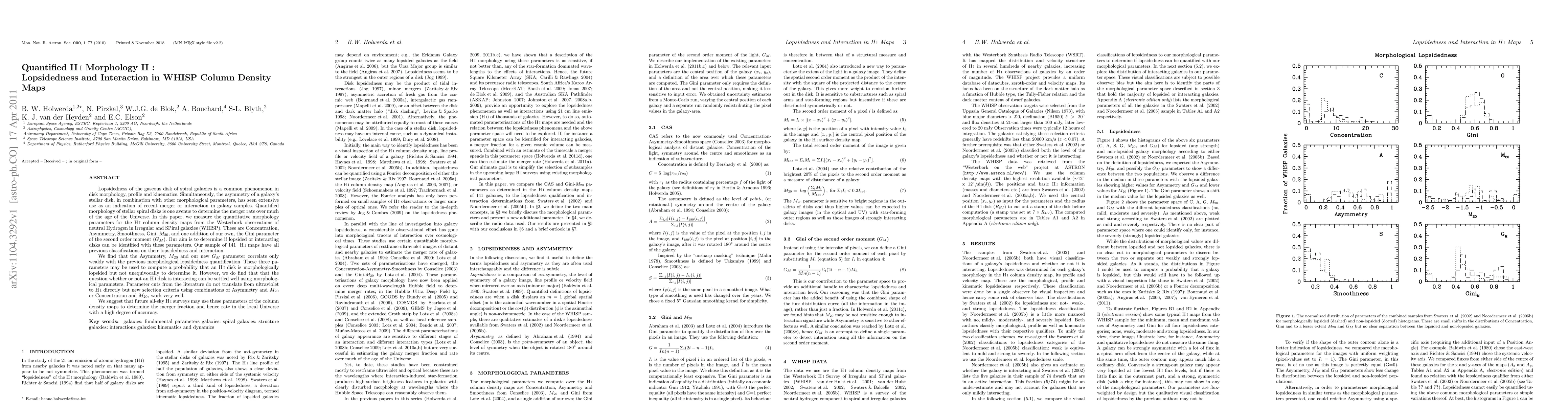 This paper measures quantitative morphology parameters for HI column density maps from WHISP to identify lopsidedness and interaction in spiral galaxies. While Asymmetry, M20, and a new GM parameter show weak correlation with previous classifications, they can compute a probability of lopsidedness. However, interaction can be well determined using these parameters, suggesting new criteria for future all-sky HI surveys to accurately assess merger rates.