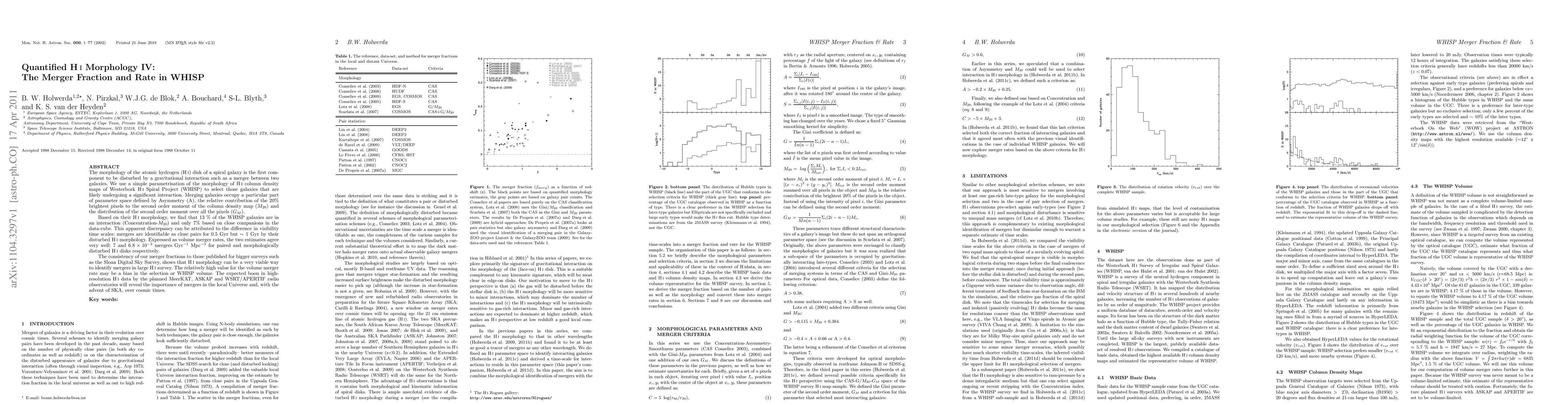 This paper investigates the merger fraction and rate in the Westerbork HI Spiral Project (WHISP) using HI morphology. It finds that 13% of WHISP galaxies show disturbed HI disks indicative of interactions, while only 7% are identified as close pairs. The study highlights the potential of HI morphology to detect mergers and suggests that future high-resolution HI data will further elucidate the role of mergers in galaxy evolution.