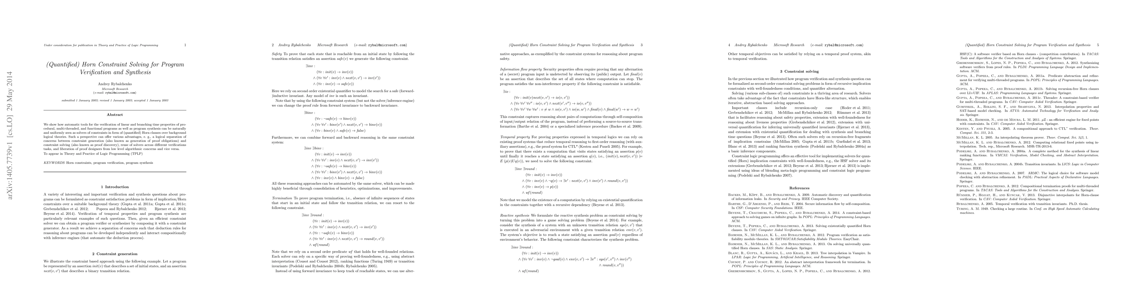 We show how automatic tools for the verification of linear and branching time properties of procedural, multi-threaded, and functional programs as well as program synthesis can be naturally and uniformly seen as solvers of constraints in form of (quantified) Horn clauses over background logical theories. Such a perspective can offer various advantages, e. g., a logical separation of concerns between constraint generation (also known as generation of proof obligations) and constraint solving (also known as proof discovery), reuse of solvers across different verifications tasks, and liberation of proof designers from low level algorithmic concerns and vice versa. To appear in Theory and Practice of Logic Programming (TPLP)