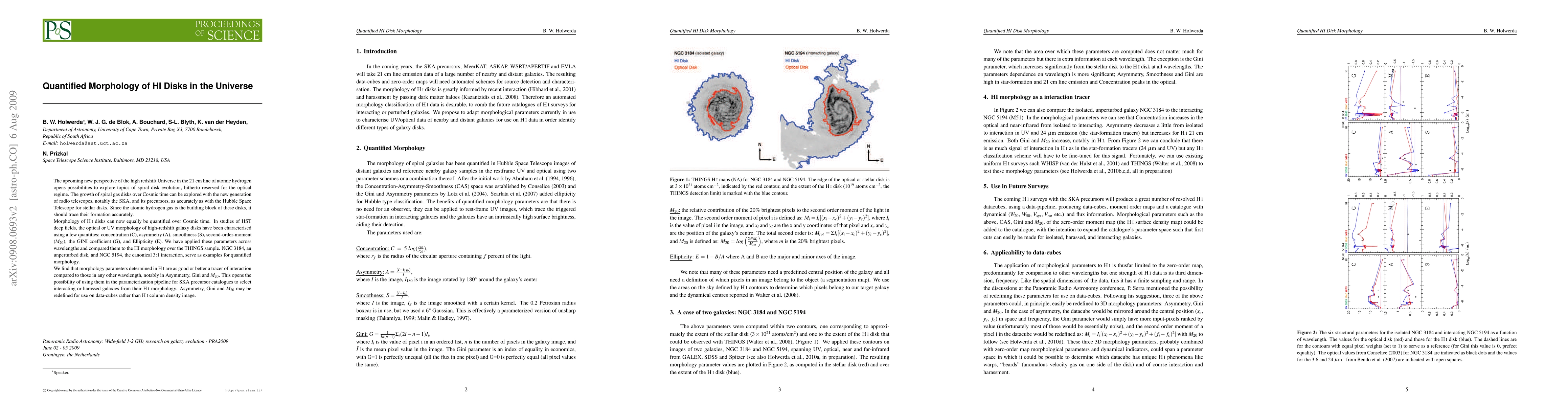 he upcoming new perspective of the high redshift Universe in the 21 cm line of atomic hydrogen opens possibilities to explore topics of spiral disk evolution, hitherto reserved for the optical regime. The growth of spiral gas disks over Cosmic time can be explored with the new generation of radio telescopes, notably the SKA, and its precursors, as accurately as with the Hubble Space Telescope for stellar disks. Since the atomic hydrogen gas is the building block of these disks, it should trace their formation accurately. Morphology of HI disks can now equally be quantified over Cosmic time. In studies of HST deep fields, the optical or UV morphology of high-redshift galaxy disks have been characterized using a few quantities: concentration (C), asymmetry (A), smoothness (S), second-order-moment (M20), the GINI coefficient (G), and Ellipticity (E). We have applied these parameters across wavelengths and compared them to the HI morphology over the THINGS sample. NGC 3184, an unperturbed disk, and NGC 5194, the canonical 3:1 interaction, serve as examples for quantified morphology. We find that morphology parameters determined in HI are as good or better a tracer of interaction compared to those in any other wavelength, notably in Asymmetry, Gini and M20. This opens the possibility of using them in the parameterization pipeline for SKA precursor catalogues to select interacting or harassed galaxies from their HI morphology. Asymmetry, Gini and M20 may be redefined for use on data-cubes rather than HI column density image.