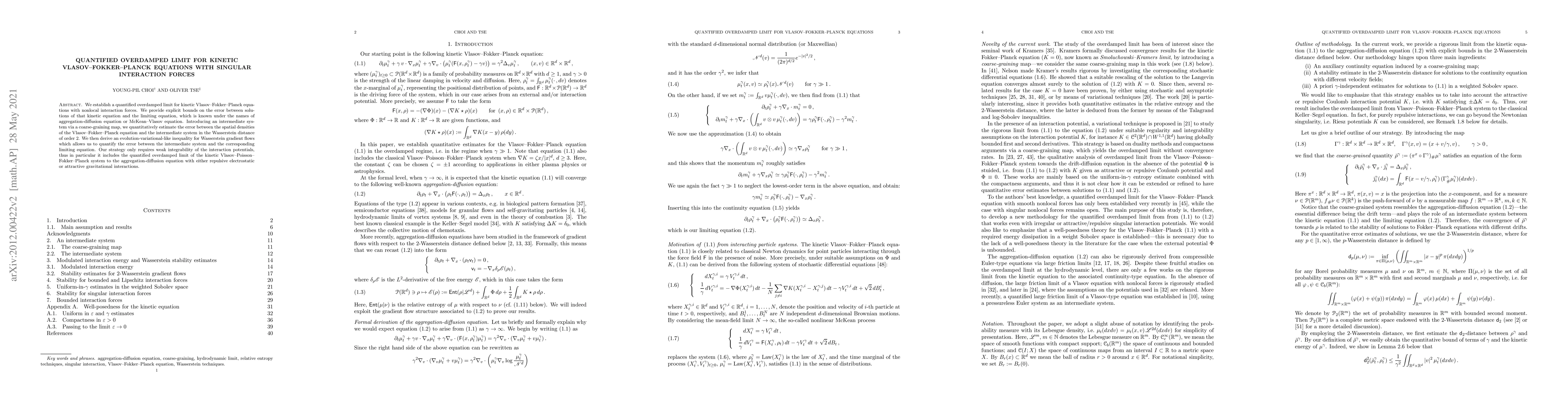 This paper establishes a quantified overdamped limit for kinetic Vlasov-Fokker-Planck equations with singular interaction forces, providing explicit error bounds between solutions and the limiting aggregation-diffusion equation. It introduces an intermediate system and uses Wasserstein distance to estimate errors, applicable to systems with weak integrability of interaction potentials.