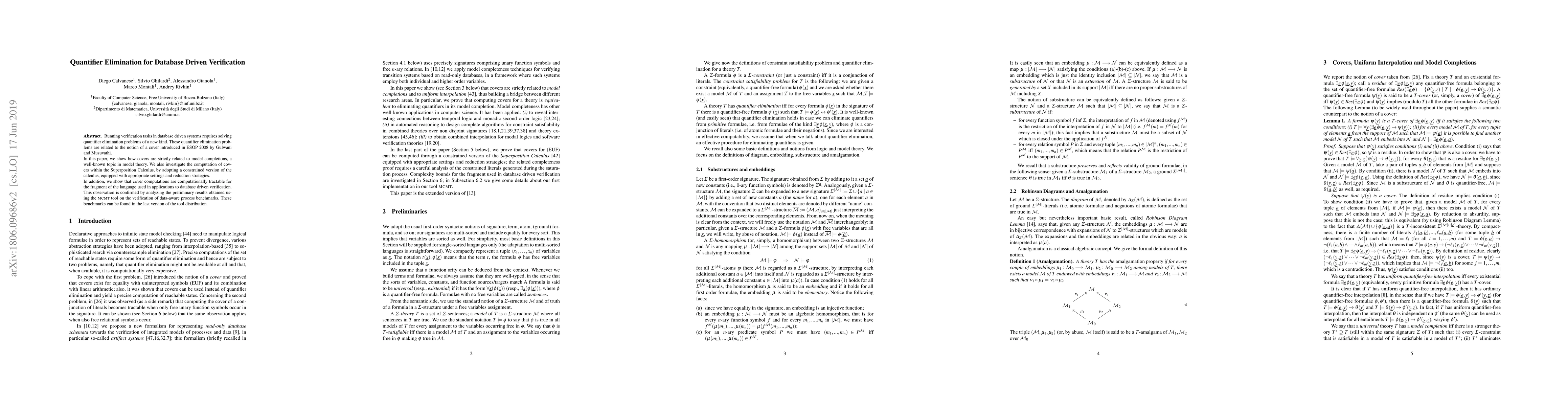 This paper explores quantifier elimination in database driven verification systems, linking covers to model completions and employing the Superposition Calculus to compute covers. It demonstrates computational tractability for relevant language fragments and validates findings using the MCMT tool on data-aware process benchmarks.