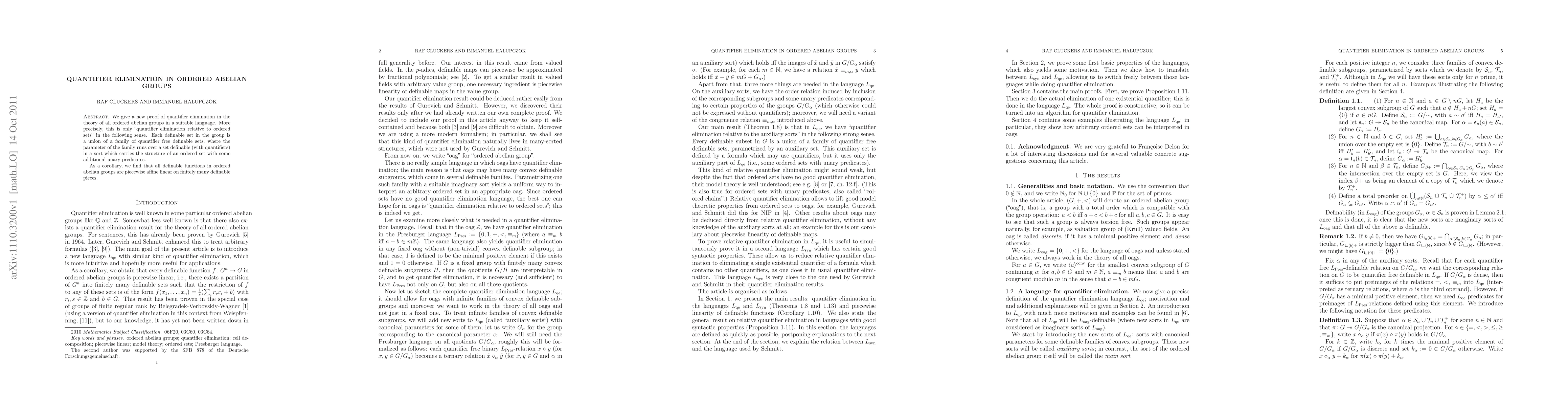 We give a new proof of quantifier elimination in the theory of all ordered abelian groups in a suitable language. More precisely, this is only "quantifier elimination relative to ordered sets" in the following sense. Each definable set in the group is a union of a family of quantifier free definable sets, where the parameter of the family runs over a set definable (with quantifiers) in a sort which carries the structure of an ordered set with some additional unary predicates. As a corollary, we find that all definable functions in ordered abelian groups are piecewise affine linear on finitely many definable pieces.